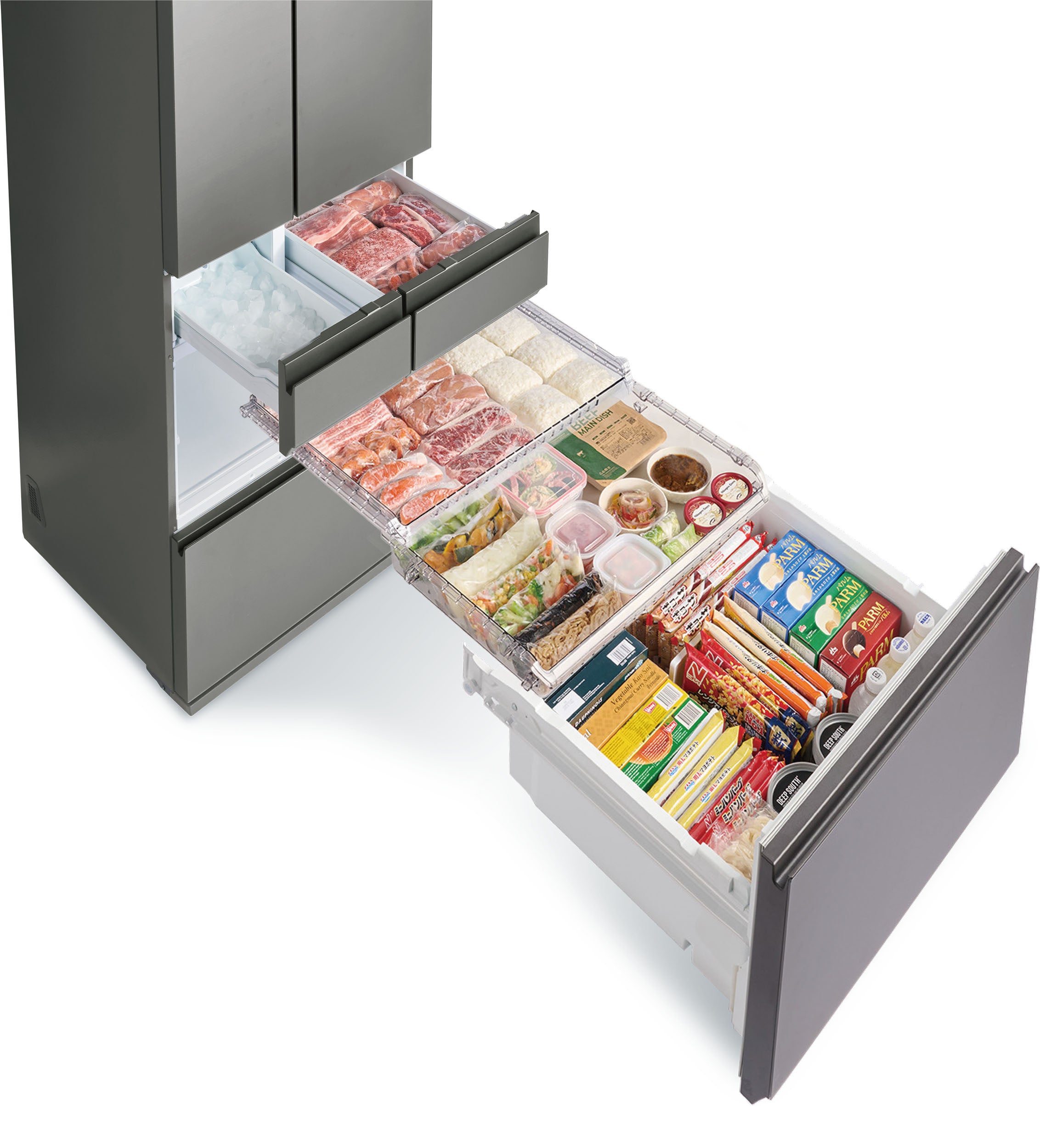 新製品では、182L[注1]の大容量冷凍室をまんなかに配置。また、急速冷凍、低温保存、スピード解凍の3ステップにより、霜付きやドリップを抑えて、素材本来のおいしさをキープします。