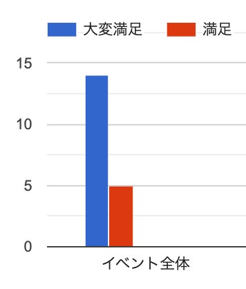 参加者30名中19名の方にアンケートに回答いただきました。イベント全体としての満足度を教えてくださいという質問に対して、大変満足・満足・なんとも言えない・不満・大変不満の5段階で選択いただきましたところ、19名に大変満足・満足と回答していただきました。