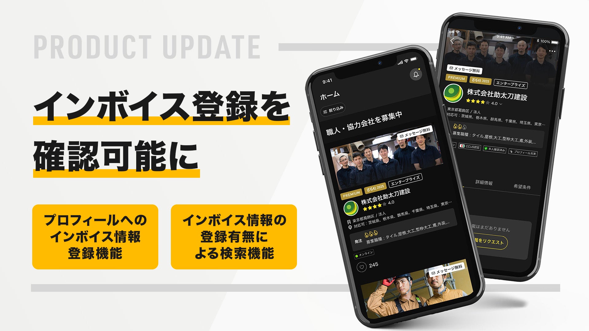 22万を超える登録事業者を誇る建設人材マッチングプラットフォームを運営する株式会社助太刀(以下、当社)は、よりスムーズな取引先選定によるユーザー体験向上に向け、マッチングサービス「助太刀」にてプロフィールに「インボイス登録情報」の入力欄を追加し、同項目による検索が可能となるアップデートを2025年11月28日に実施します。