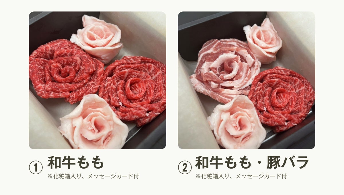 - 商品名:①母の日ギフト ミートフラワー(和牛モモ)/②母の日ギフト ミートフラワー(和牛モモ・豚バラ)