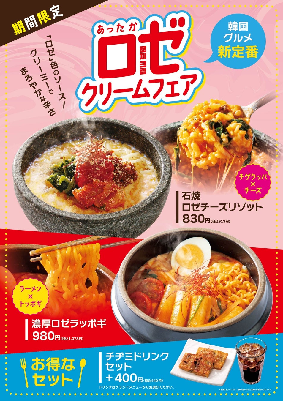 今年4月に創業25周年を迎えた石焼ビビンバ専門店「アンニョン」では12月4日(水)より、韓国発祥の新定番グルメ「ロゼクリーム」を使用した新メニュー2種類を期間限定で販売いたします。「ロゼクリーム」はトマト、クリーム、コチジャンなどを使用したロゼカラー※のソースでクリーミーでまろやかな味わいが韓国国内で人気を博しています。今回は特製チゲスープにロゼクリームを加え、チーズとバターも混ぜ合わせた「石焼ロゼチーズリゾット」と、トッポギ(韓国もち)、チーズ、ちぢれ麺にロゼクリームを絡み合わせた「濃厚ロゼラッポギ」をご用意いたしました。どうぞ韓国で流行のグルメをお楽しみください。皆様のご来店をスタッフ一同お待ちしております。