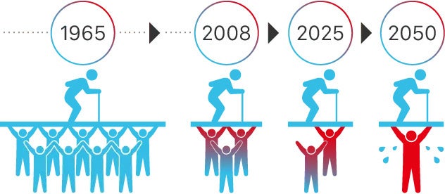1950年には現役世代12.1人で65歳以上の高齢者を支えていましたが、2040年には現役世代1.5人で1人の高齢者を支えることになると予想されています。 ※出典:内閣府「令和2年版高齢社会白書(全体版)」