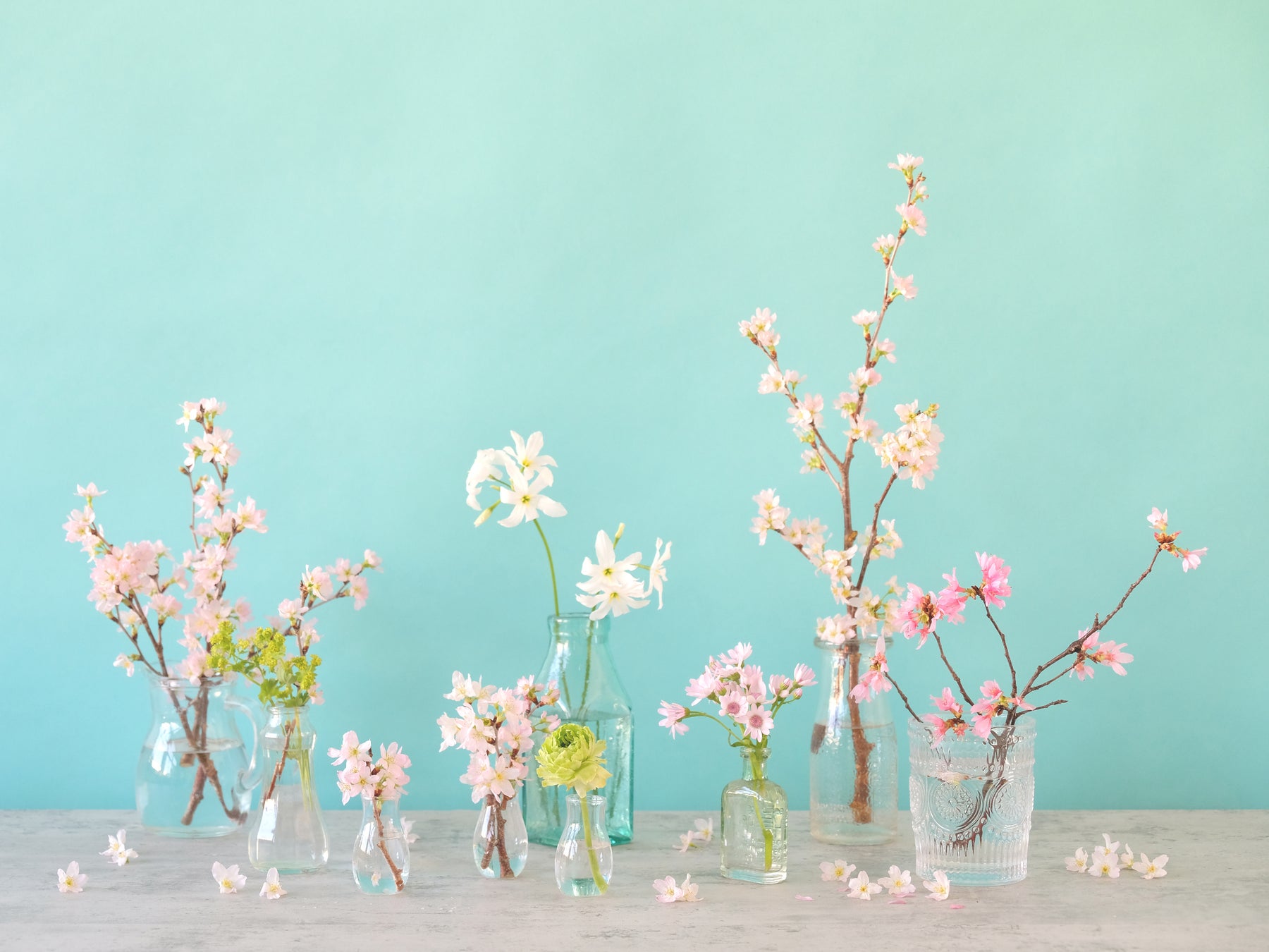 右:枝いっぱいに花がつく桜。花瓶に生ける時、水につかる部分の花は水が濁る原因になるので取り除きます。摘み取った花は水に浮かべて楽しみましょう。
