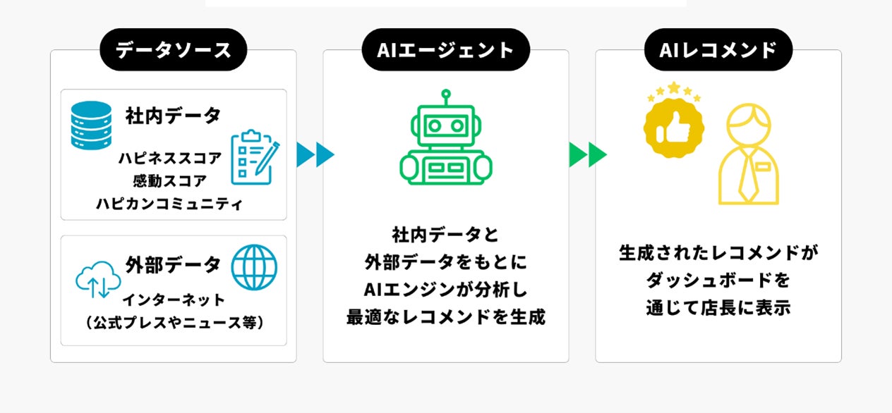 「心的資本経営」を原動力に、世界中へ食の感動体験を提供する株式会社トリドールホールディングス(東京都渋谷区、代表取締役社長 兼 CEO 粟田 貴也、以下、トリドールHD)は、従業員の幸福感(ハピネス)とお客様の感動(カンドウ)が好循環する独自の実践モデル「ハピカン繁盛サイクル※1」をデータドリブンに強化するシステムとして、従業員の「ハピネススコア※2」と顧客の「感動スコア※3」や各店舗での成功事例データなどをもとにAIエージェントが分析し最適な改善アクションを自動提案する「AIレコメンド機能」をアルサーガパートナーズ株式会社(本社:東京都渋谷区、代表取締役会長 兼 CTO:小俣泰明、代表取締役CEO:渡邉純平、以下、アルサーガパートナーズ)と共同開発しました。また、株式会社プレイド(東京都中央区:代表取締役CEO 倉橋健太、以下、プレイド)とともに、これらのデータを集約・可視化し店舗で活用できるダッシュボード、「ハピカンダッシュボード」を開発しました。2025年12月より、丸亀製麺の全店舗で「ハピカンダッシュボード」の運用を開始します。