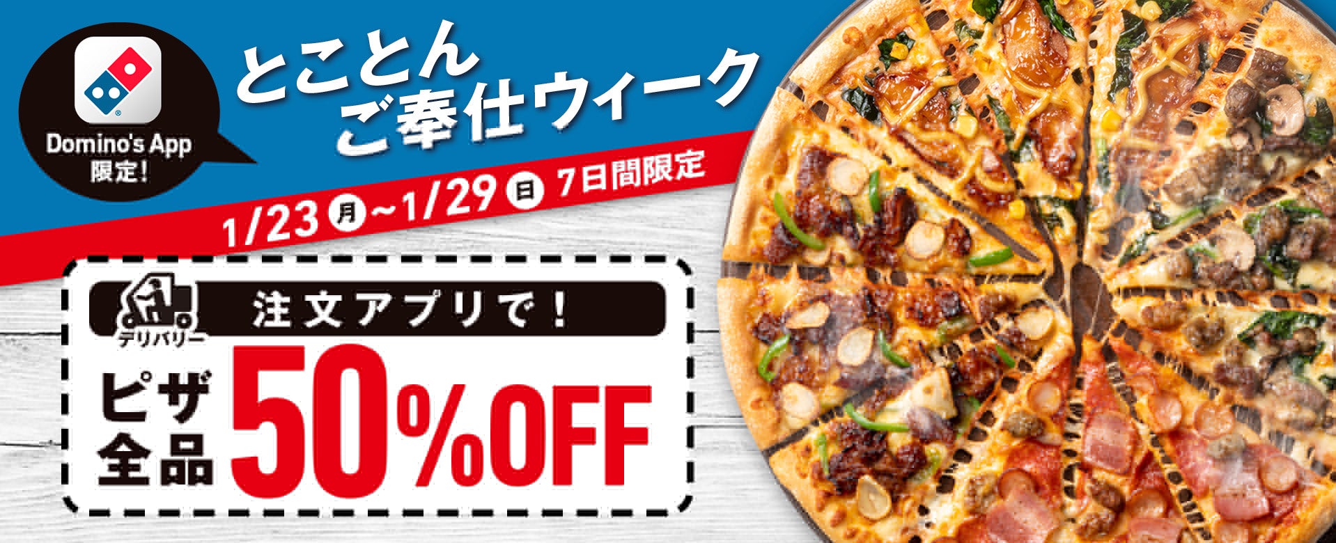 内容 :すべてのピザがデリバリー半額(50%オフ)