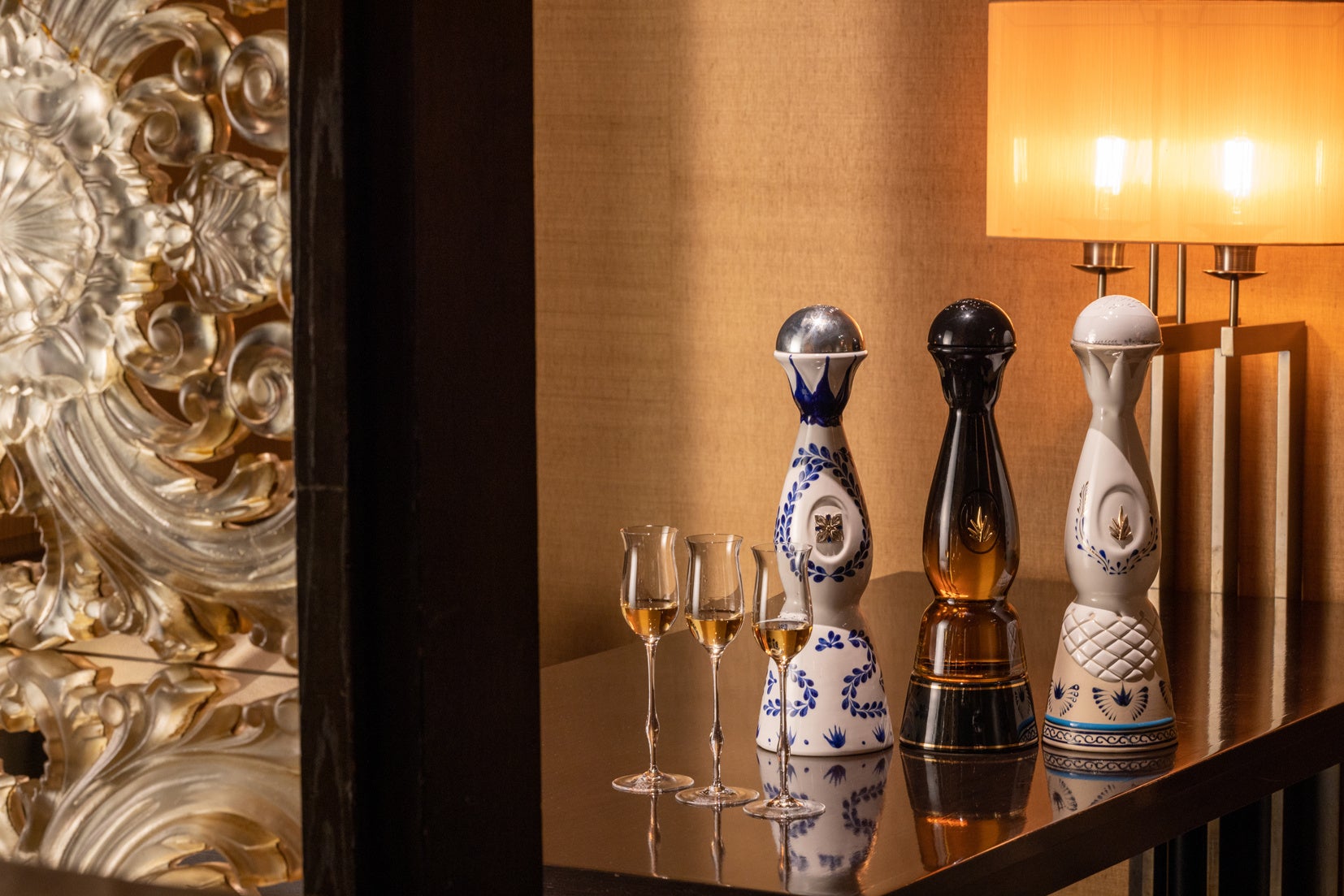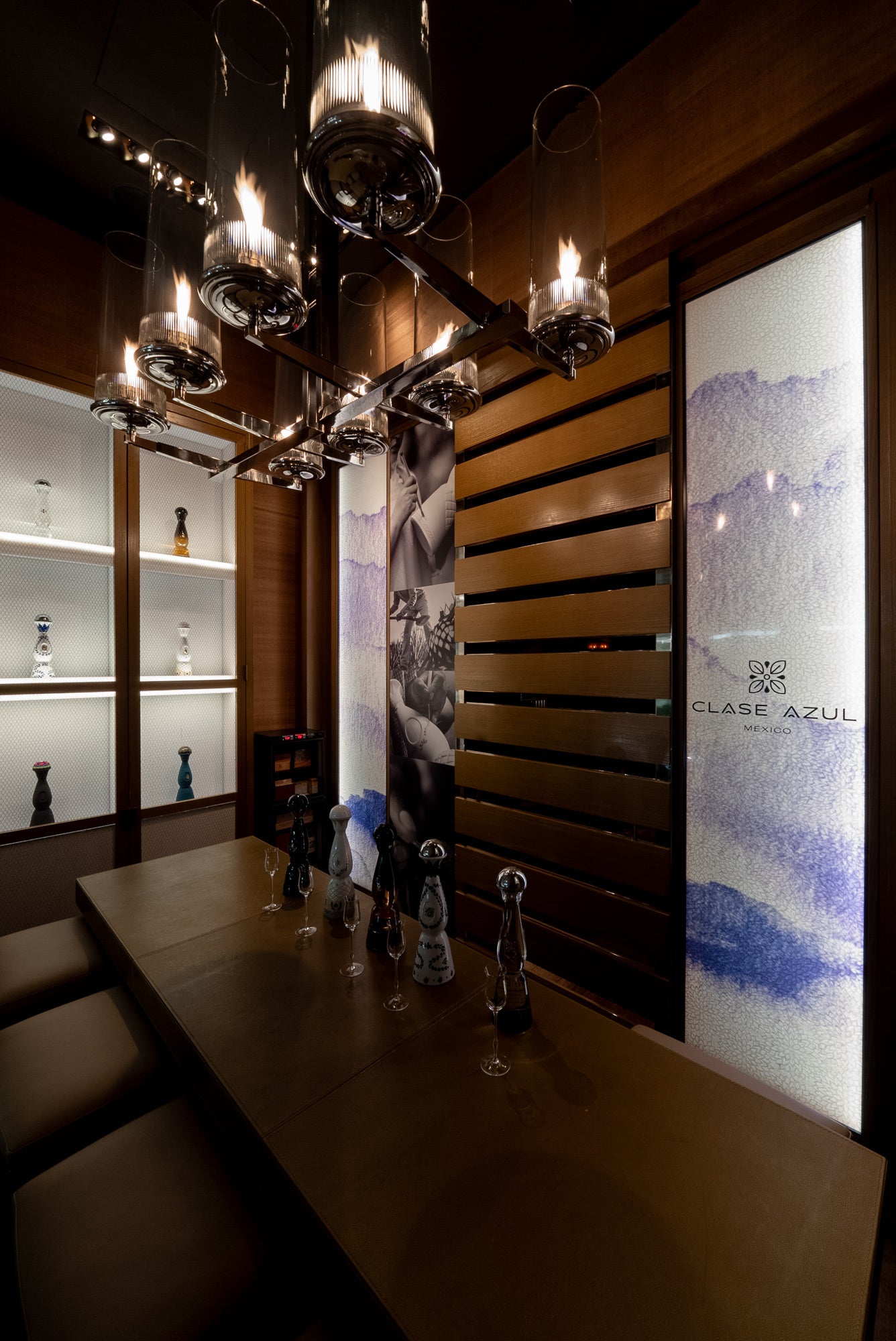 「Clase Azul Mexico meets Japan(メキシコのクラセアスールが日本と出会う)」というテーマの元につくられたこの「Room Azul(ルーム・アスール)」の内装には、日本の伝統工芸である美濃和紙を使用しているのが特徴です。日本とメキシコ両方の伝統工芸には、自然から得られるインスピレーションや素材、熟練の職人によって行われる繊細な仕事ぶりなどの共通点が多く、独自の風合いが美しい美濃和紙と、メキシコの伝統的な製法でひとつひとつ手作業でつくられたクラセアスールのデキャンタをディスプレイすることにより、日本とメキシコの伝統やクラフトマンシップを感じていただけるよう工夫しています。双方の職人の仕事がVIPルーム全体に温かみと華やかさを添え、ここでしか感じることのできない日本とメキシコの文化的なつながりを体験しながら優雅なひとときをお過ごしいただけます。「マデュロ」では、クラセアスールの全ラインナップであるテキーラ5種とメスカル2種を取り揃えるほか、テイスティングメニューをご提供いたします。VIPルームでお楽しみいただくことにより、メキシコと日本の文化の融合を感じながら、特別な空間でプレミアムテキーラをご堪能いただけます。