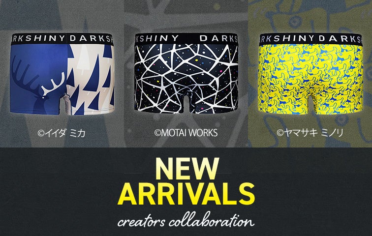DARK SHINYクリエイターズコラボは、クリエイターの世界観が表れたデザインが豊富なアンダーウェアをキャンバスとした作品です。「自分の作品を様々な形で世の中に残していきたい」、「インパクトがある商品をきっかけに、一人でも多くの人に知ってもらいたい」という思いを持ったクリエイターを応援する目的で展開。新しいものを探している人、他人とは違うものを持ちたい人、推しクリエイターを応援したい人に、眺めて楽しむ喜び、穿いて楽しむ喜びを提供できるギャラリーのような存在を目指しています。好きなクリエイターの作品をいつでも身につけることができ、クリエイターをアンダーウェアという作品を介して応援できるのが「DARK SHINYクリエイターズコラボ」なのです。