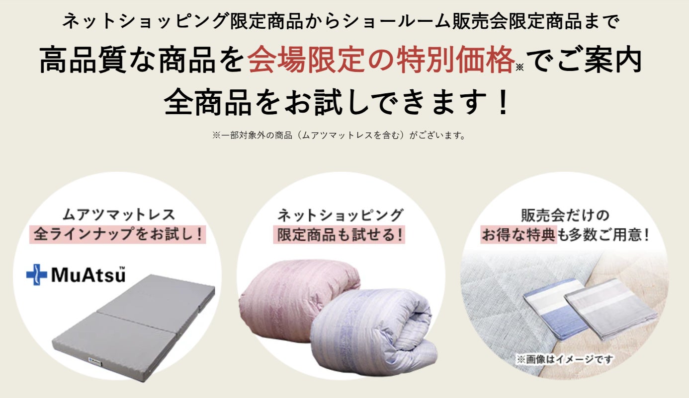 話題の新モデル「30年MuAtsu(ムアツ)」を含むムアツシリーズや高品質寝具をすべてお試しいただけます!