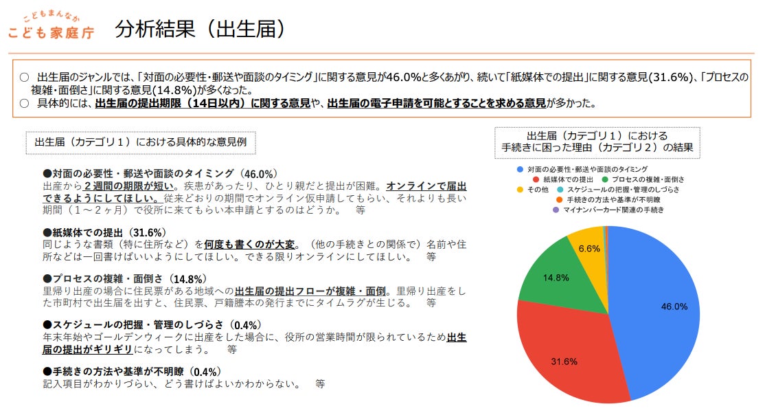 特に「オンラインで届出を完結したい」「同じ内容を何度も書くのが大変」といった声が多く、これらの意見は、出生届のオンライン申請や、妊婦健診、母子保健手帳、予防接種における民間アプリの活用など、「こども政策のDX」の具体的な取り組みに活かされています。