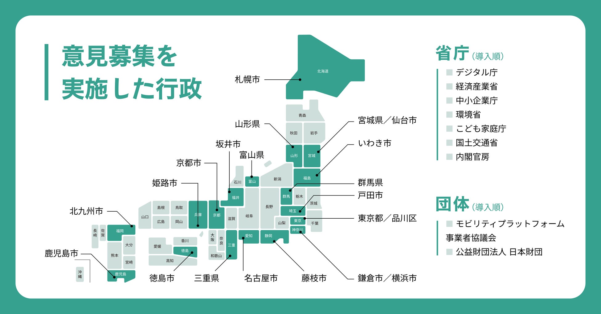 これまで、7つの省庁、21の自治体、2団体と連携し、約3万7000件(※集計中の案件を除く)のコメントが寄せられました。これらの声は、行政が政策を検討・立案する上での重要な参考情報として活用されています。
