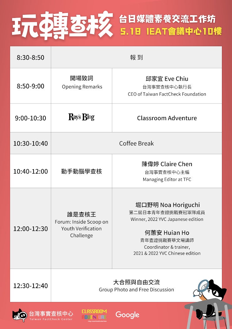このローンチを記念して、2024年5月18日-22日に台湾台北市で「Ray’s Blog」を一般参加者向けとメディア関係者向けに開催します。これは、Google台湾と台湾ファクトチェックセンターとの共同により実現しました。学生向け・教育関係者向けのワークショップとメディア関係者向けプレスカンファレンス、そして台北市の2つの高校での授業を行います。