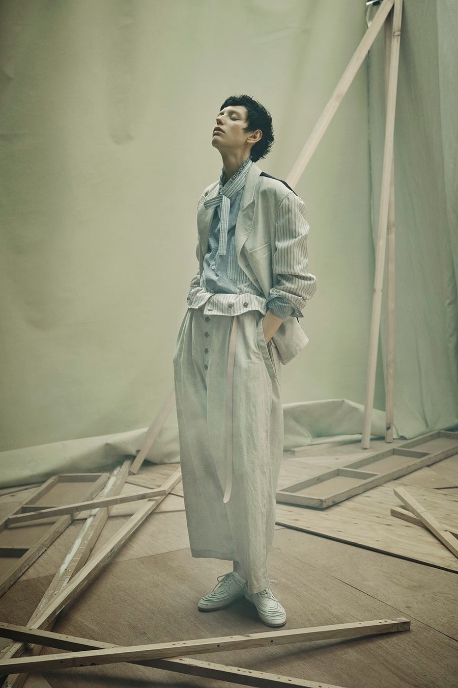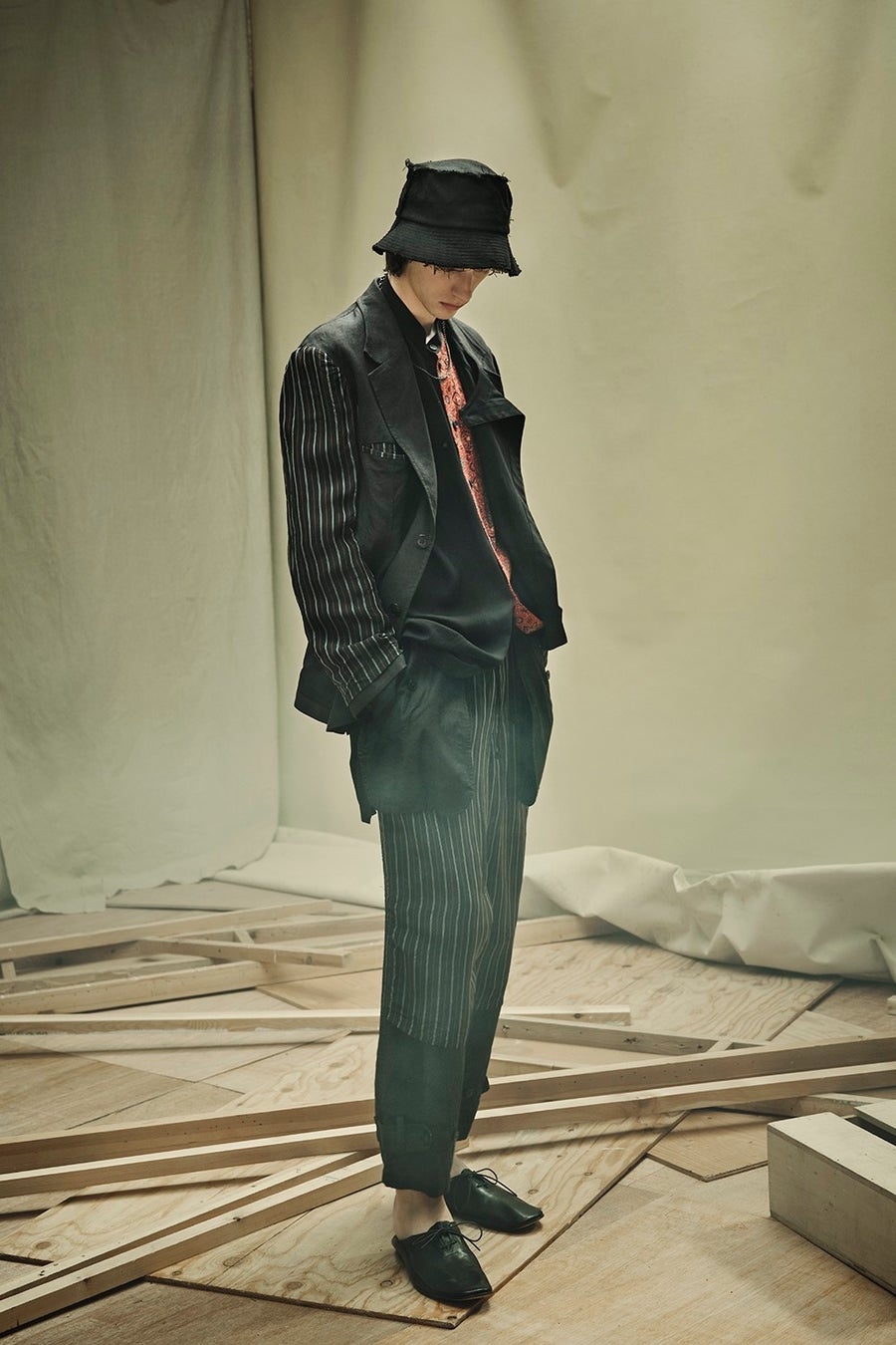 縞裏キュプラやポケット袋布などを表出しする究極のインサイドアウトの技法を取り入れたセットアップ、スポーツジャージにクラシック生地を掛け合わせたセットアップ、メッシュの透け感とハーフパンツのパンキッシュなコーディネートなど、S’YTEならではの「陰」と「陽」を巧みに使い分け、二面性を表現したコレクションをご提案致します。