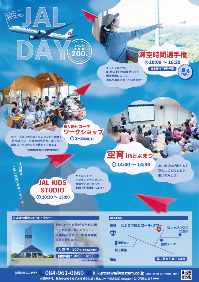 国内外で折り紙ヒコーキの普及活動を行っている折り紙ヒコーキ協会(広島県福山市、会長:戸田拓夫)は、JAL(日本航空)社員による空の仕事についての講座やワークショップ、滞空時間選手権などを盛り込んだ「JAL DAY」を2025年9月27日(土)10時より開催します。