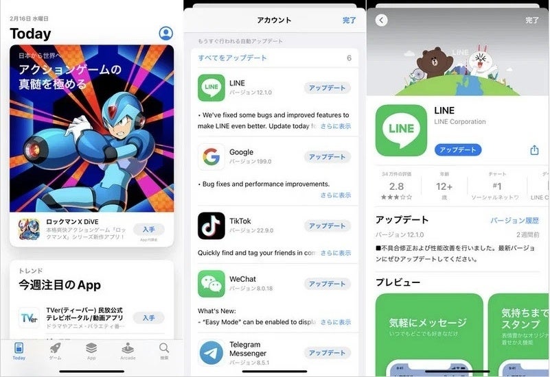 古いバージョンのLINEアプリを利用していると、LINEの引き継ぎが上手くいかない原因となることがありますので、最新バージョンにアップデートしましょう。App Storeを開いて、右上のユーザーアイコンをタップすると、アップデート可能なアプリの一覧が表示されますので、LINEアイコンの横の「アップデート」ボタンを押してください。