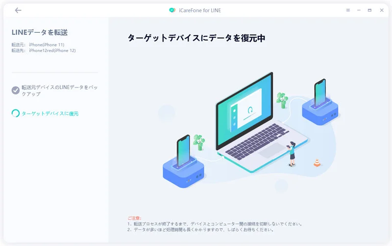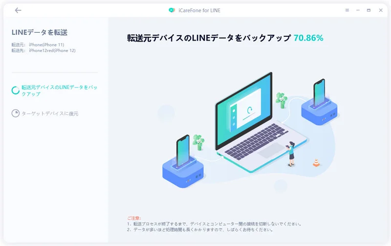 Step1:iCareFone for LINEを起動したPCに、データ移行元のiPhoneと移行先のiPhoneをUSBケーブルで接続し、デバイスが認識されたら「転送」をクリックします。