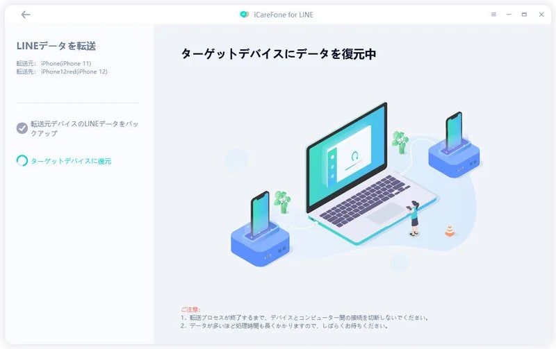 iCareFone for LINEは、iPhoneからiPhoneはもちろん、iPhoneとAndroidの異なるOS間でも、全てのトーク履歴を短時間で簡単に引き継ぐことができるソフトです。データのバックアップにiCloudを利用しないため、iCloudの空き容量を気にすることなく、LINEのトーク履歴や写真、LINEスタンプ、添付ファイルなどをスムーズに引き継げます。