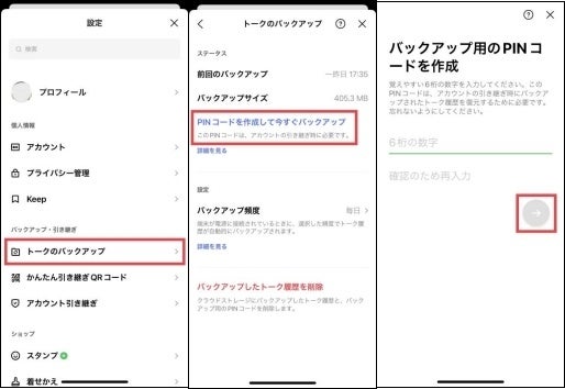 万が一のトラブルでトーク履歴を失うことがないよう、トーク履歴をiCloudにバックアップしておきましょう。LINEの設定アイコン>「トークのバックアップ」>「PINコードを作成して今すぐバックアップ」の順にタップして、PINコードを設定すると、その時点のバックアップをすぐに作成できます。