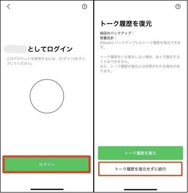 Step5:新しいiPhoneに自分のアカウント情報が表示されますので、「ログイン」>「トーク履歴を復元せずに続行」>「OK」の順にタップします。