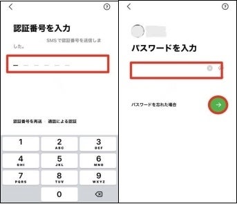 Step5:電話番号を入力すると、SMSで6桁の認証番号が届きますので、その認証番号を入力し、続いてLINEアカウントのパスワードを入力します。