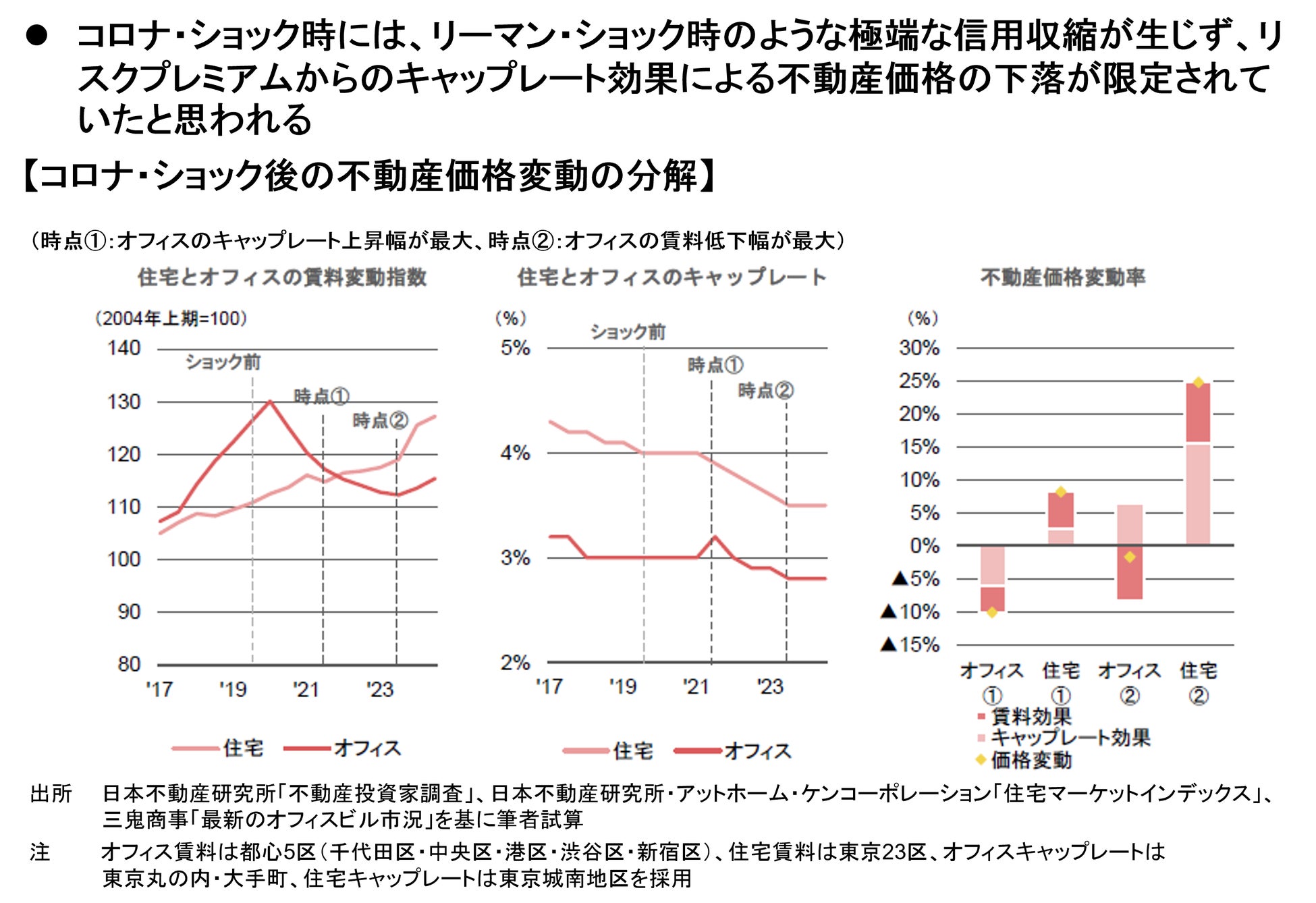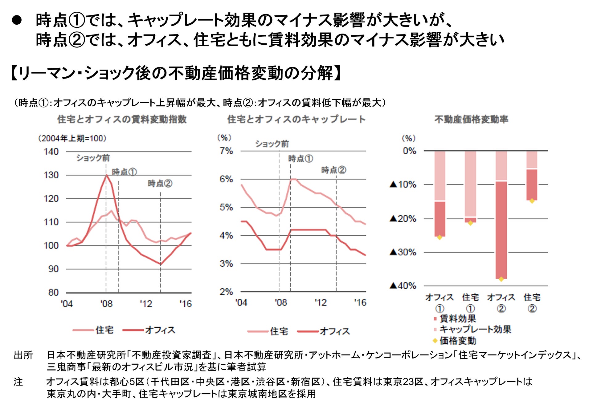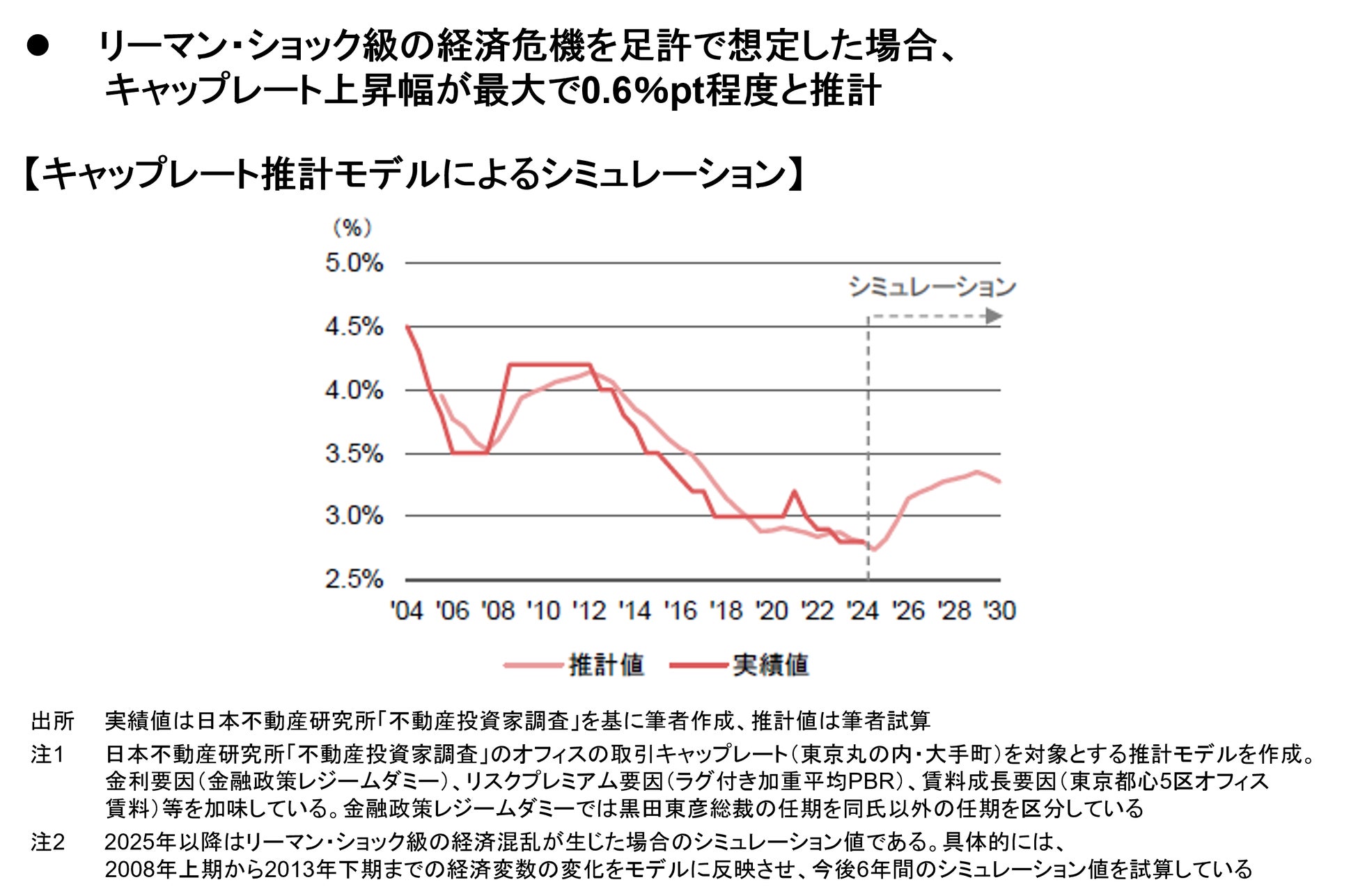 リーマン・ショック級の経済危機を足許で想定した場合、その直後で▲27%、賃料への経済環境変化反映後で▲40%の都心オフィス価格低下を想定