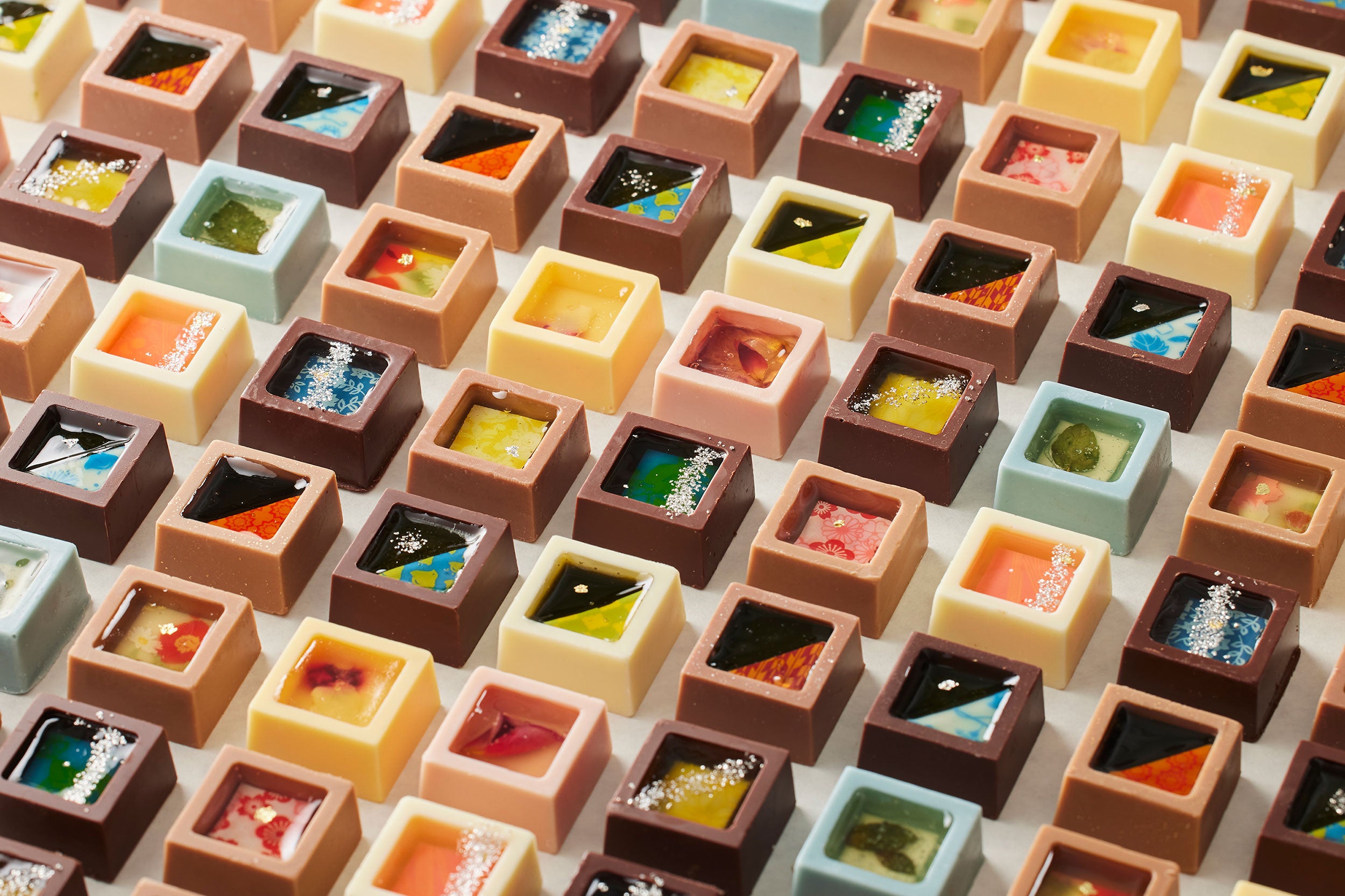 - ガナッシュ、キャラメル、プラリネを閉じ込めた贅沢な⼝どけのチョコレート ”彩ショコラ”