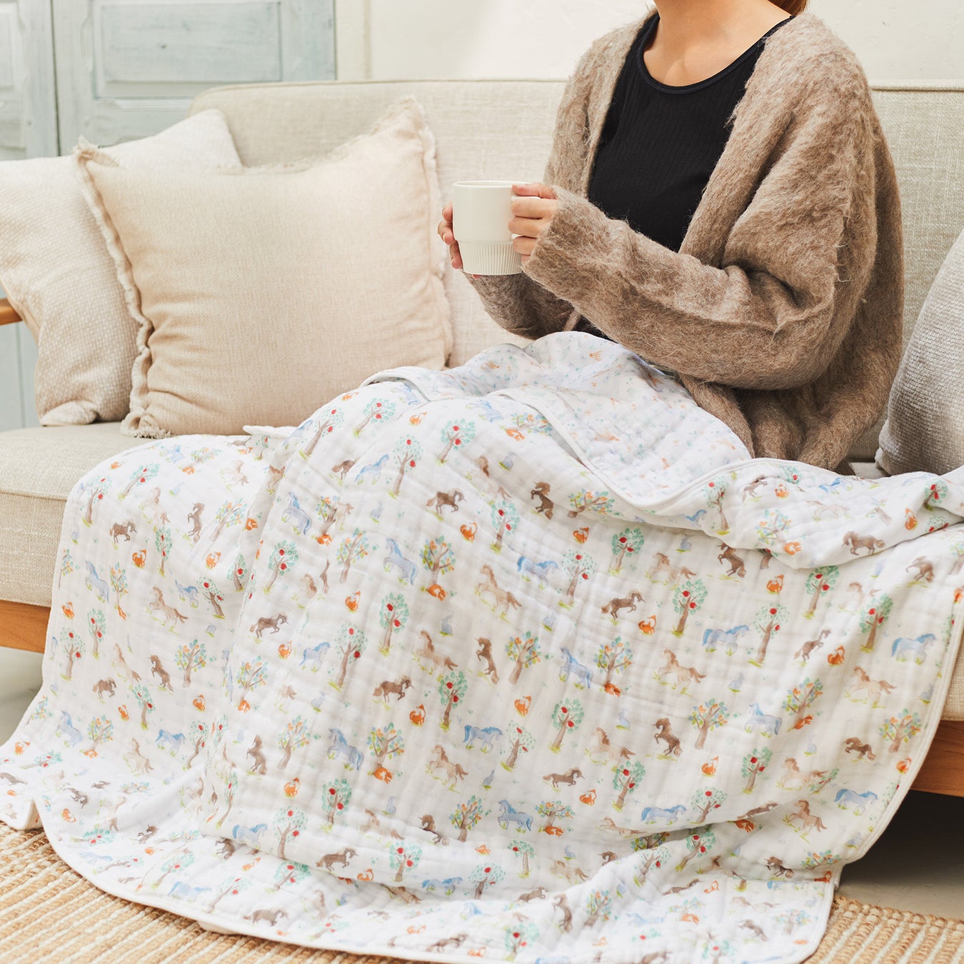 ダブルガーゼ4層構造で厚みがあり、掛けたり敷いたり様々なシーンで活躍。120cm×120cmの大きめサイズなので、大人がひざ掛けとして使用することも可能。親子のくつろぎタイムにぴったりです。