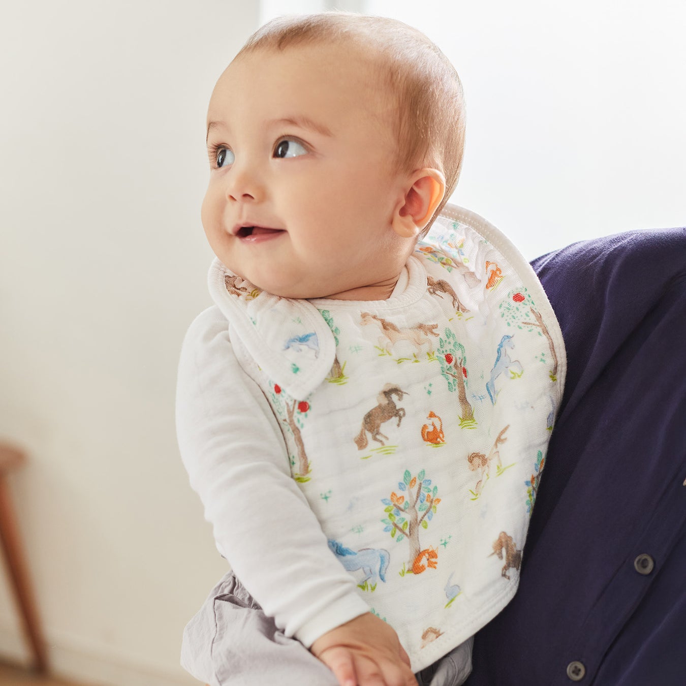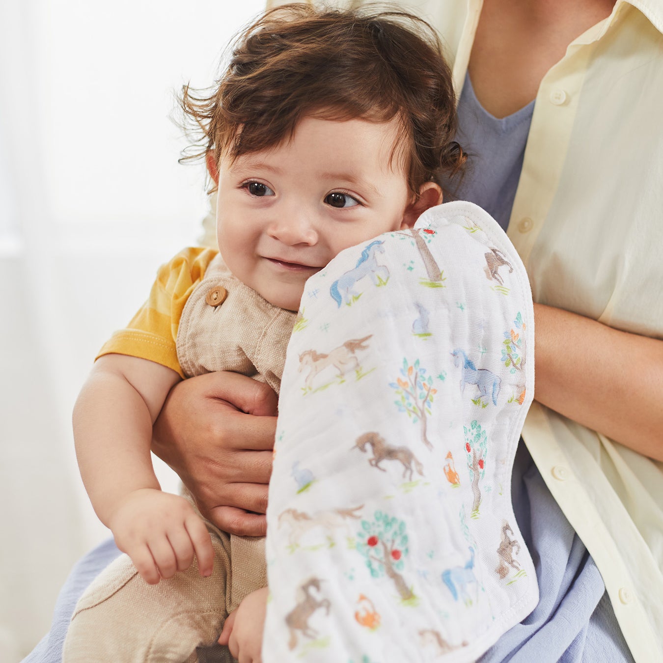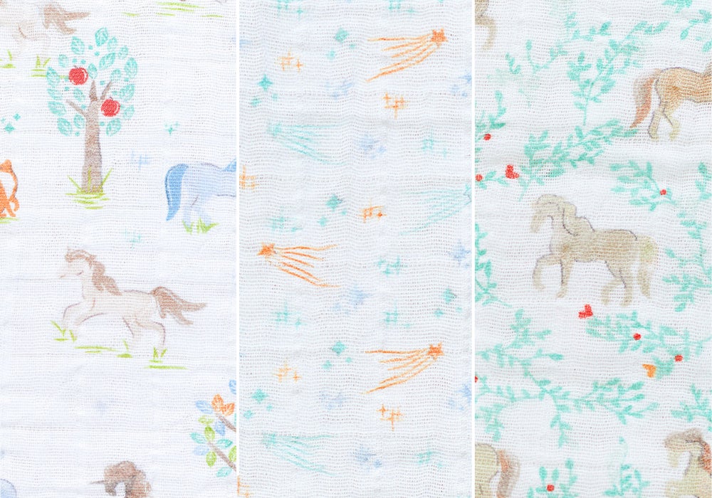 安心して赤ちゃんにご使用いただける素材、モスリンコットン。縦糸と横糸を優しくていねいに平織りしたモスリンは通気がよく、ふんわりと柔らかい肌ざわりが魅力です。シーンや気分で使い分けて楽しい、バリエーション豊富なデザインで、パパママの嬉しいポイントを押さえました。もちろん洗濯機で簡単にお手入れ可能。洗うたびにふんわり心地よい肌ざわりで、長くご愛用いただけます。