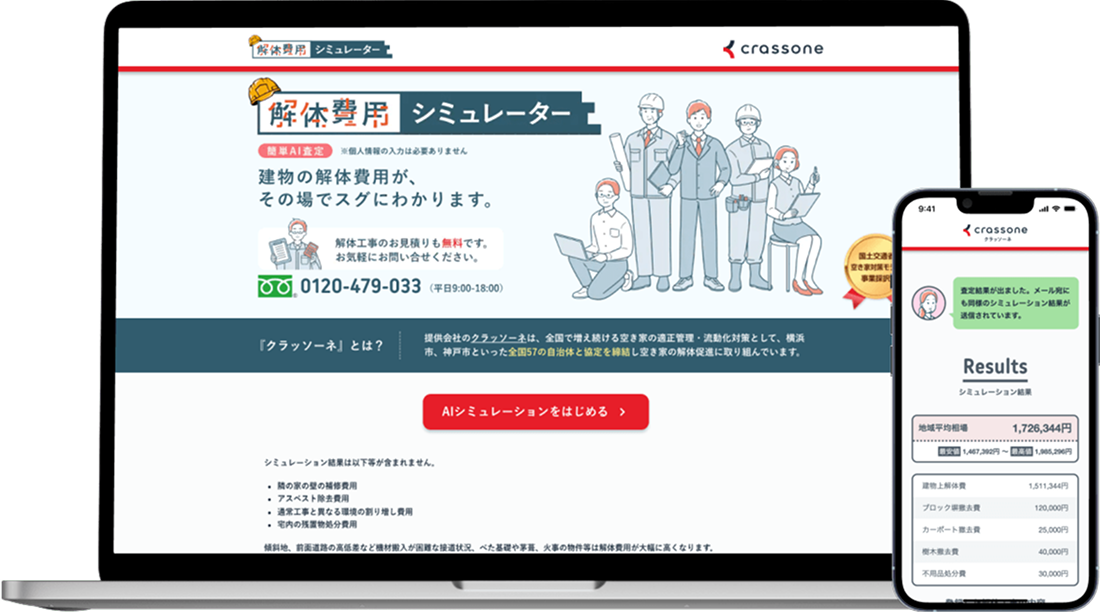スマートフォンやパソコンから10個の質問に答えるだけで、遠隔地からでも解体費用の相場が把握可能なサービスです。過去13万件の見積もりデータをもとに概算費用を算出しており、個人情報の登録をすることなく利用することができます。