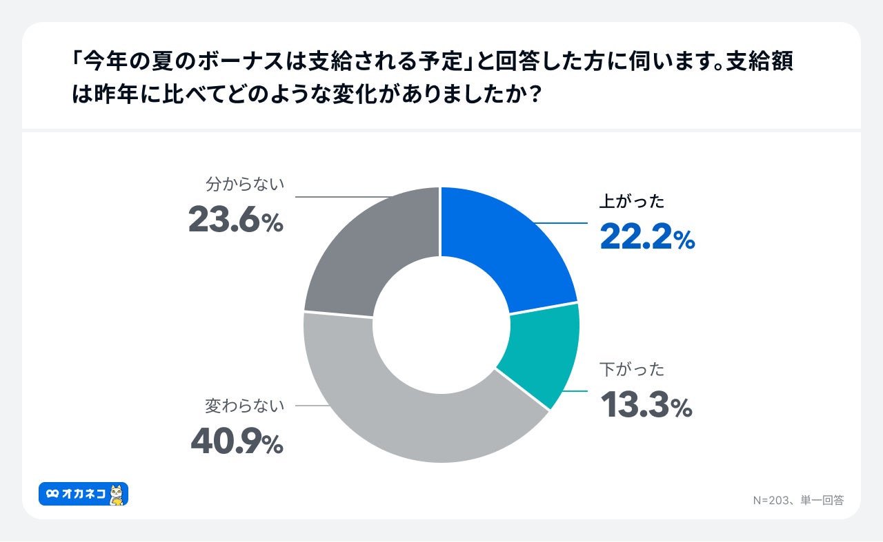 ボーナス支給額は「上がった」22.2%、「下がった」13.3%