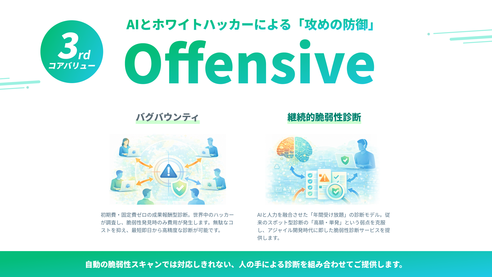 【新】AI脆弱性診断:AIと人力を融合させた「年間受け放題」の診断モデル。従来のスポット型診断の「高額・単発」という弱点を克服し、アジャイル開発時代に即した脆弱性診断サービスを提供します。