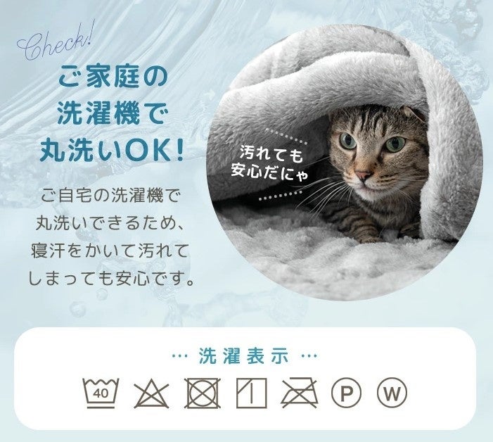 毎日使う寝具は、寝汗などが蓄積され汚れが気になることは勿論、本製品はねこにも一緒に使ってもらうことを考え、洗濯機で丸洗いすることが可能になっており、いつでも清潔にご使用いただくことができます。
