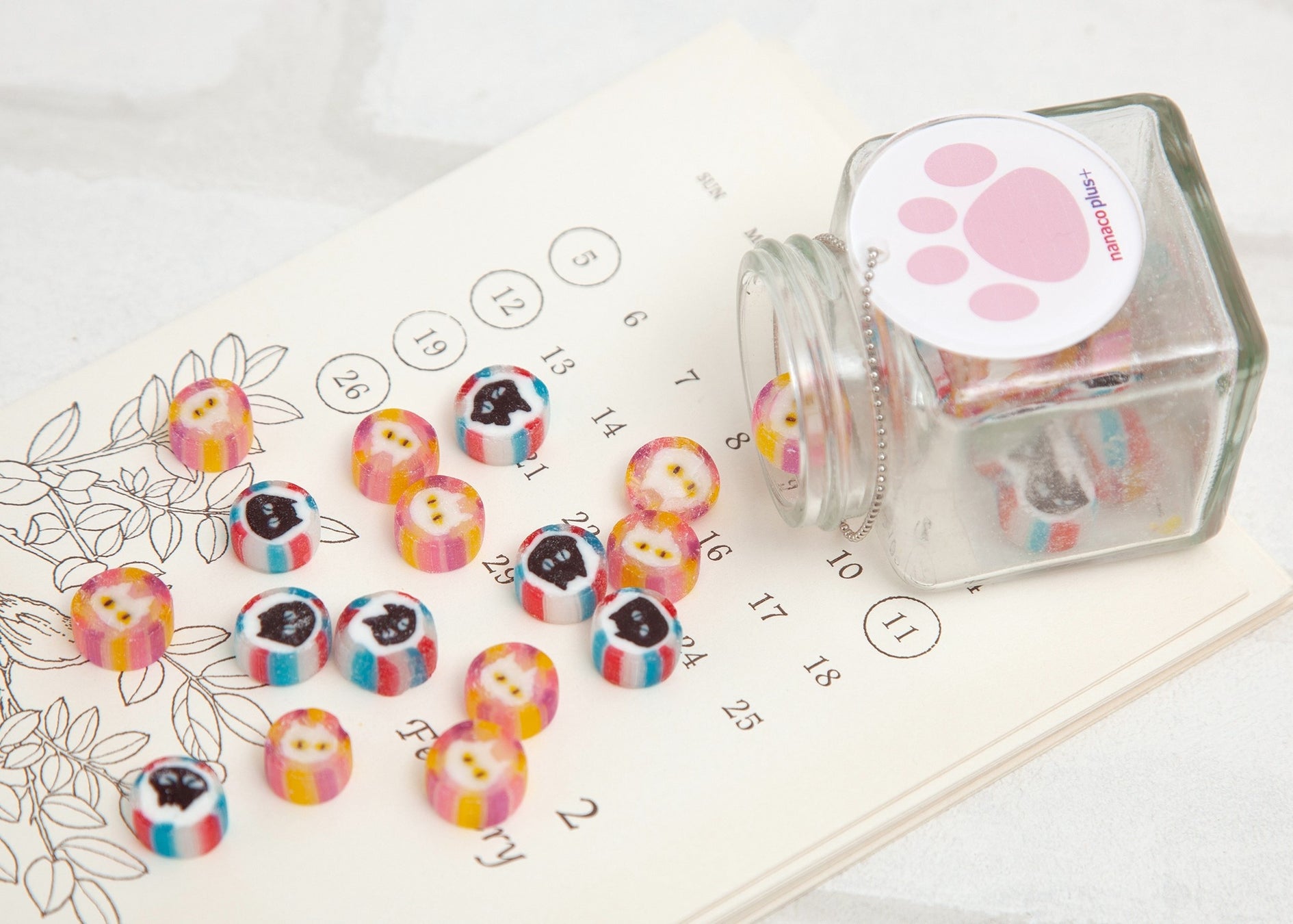 ホワイトキャットとブラックキャットの柄の飴が手のひらサイズのびんに入っています。ねこの肉球柄のかわいいチャーム付きです。
