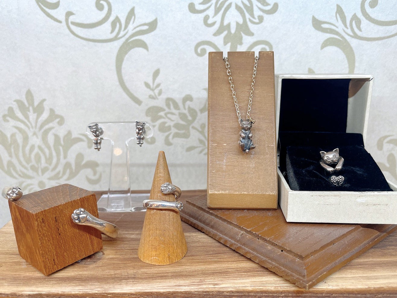 猫をモチーフにした手作りのシルバーアクセサリー。バングルとリングは肉球をイメージしたデザインです。