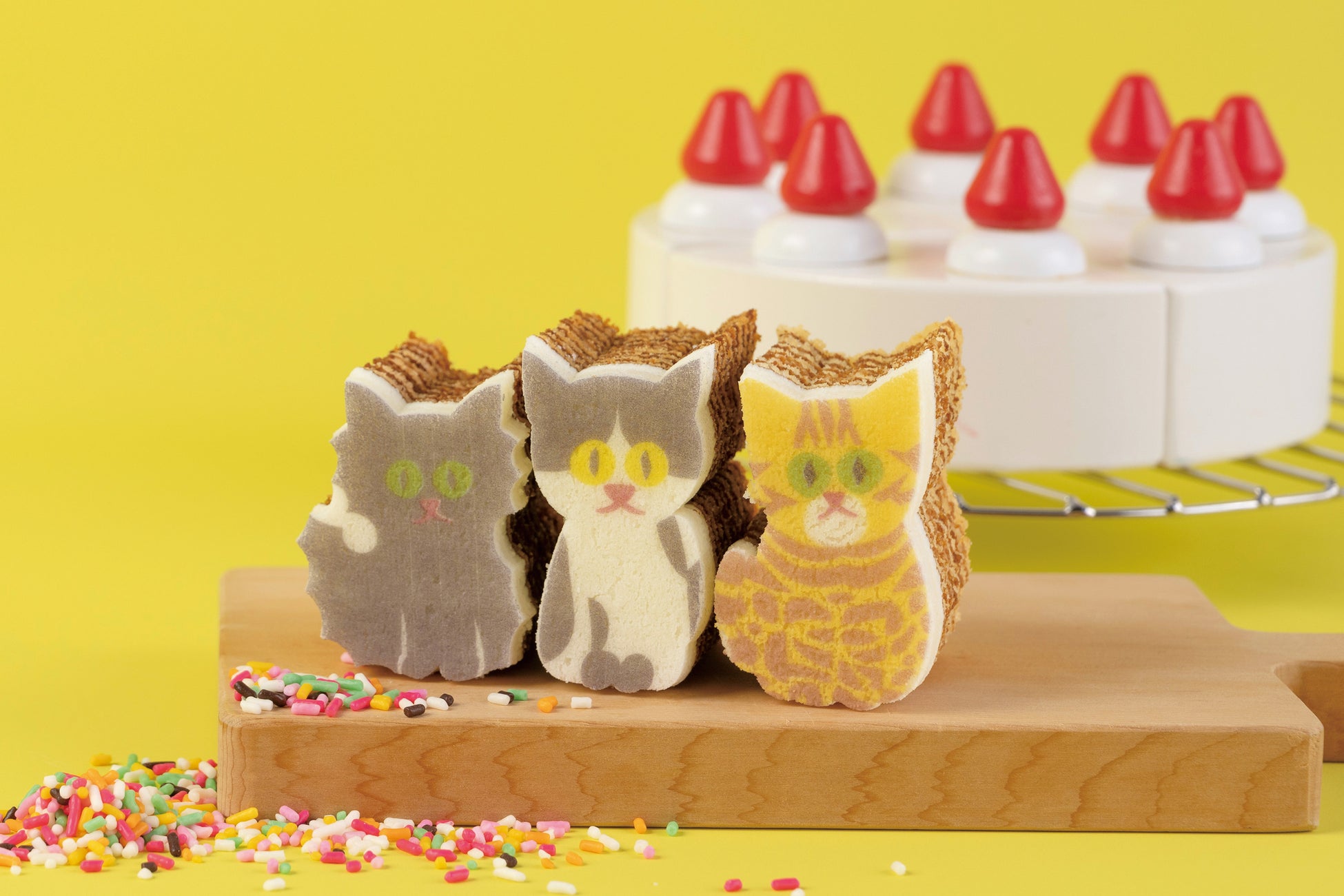 3種類のねこをモチーフにした、くろねこ(イチゴ味)、ぶちねこ(キャラメル・サレ味)、ベンガルねこ(プレーン味)の型ぬきバウム3個セットです。