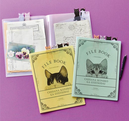 A4サイズが入る8ポケット仕立てのクリアファイルブック。ファイルの上には、茶トラ、サバトラ、黒猫、ハチワレの4匹の子猫たちがひょっこり。ファイルブックを開くとへそ天姿の子猫が現れます。