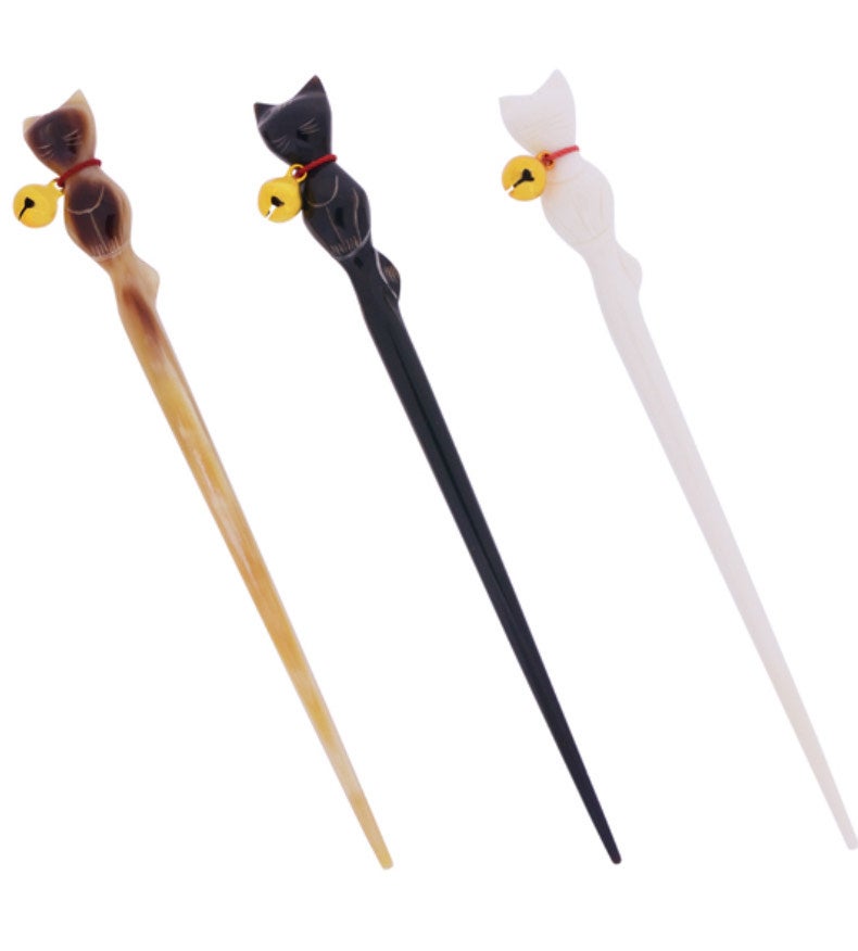 猫好きの心をつかんで離さない、ちょこんとお座りしたデザインのかんざし。水牛の角でできており、一本一本模様の出方に個性があるため、選ぶのが楽しいかんざしです。