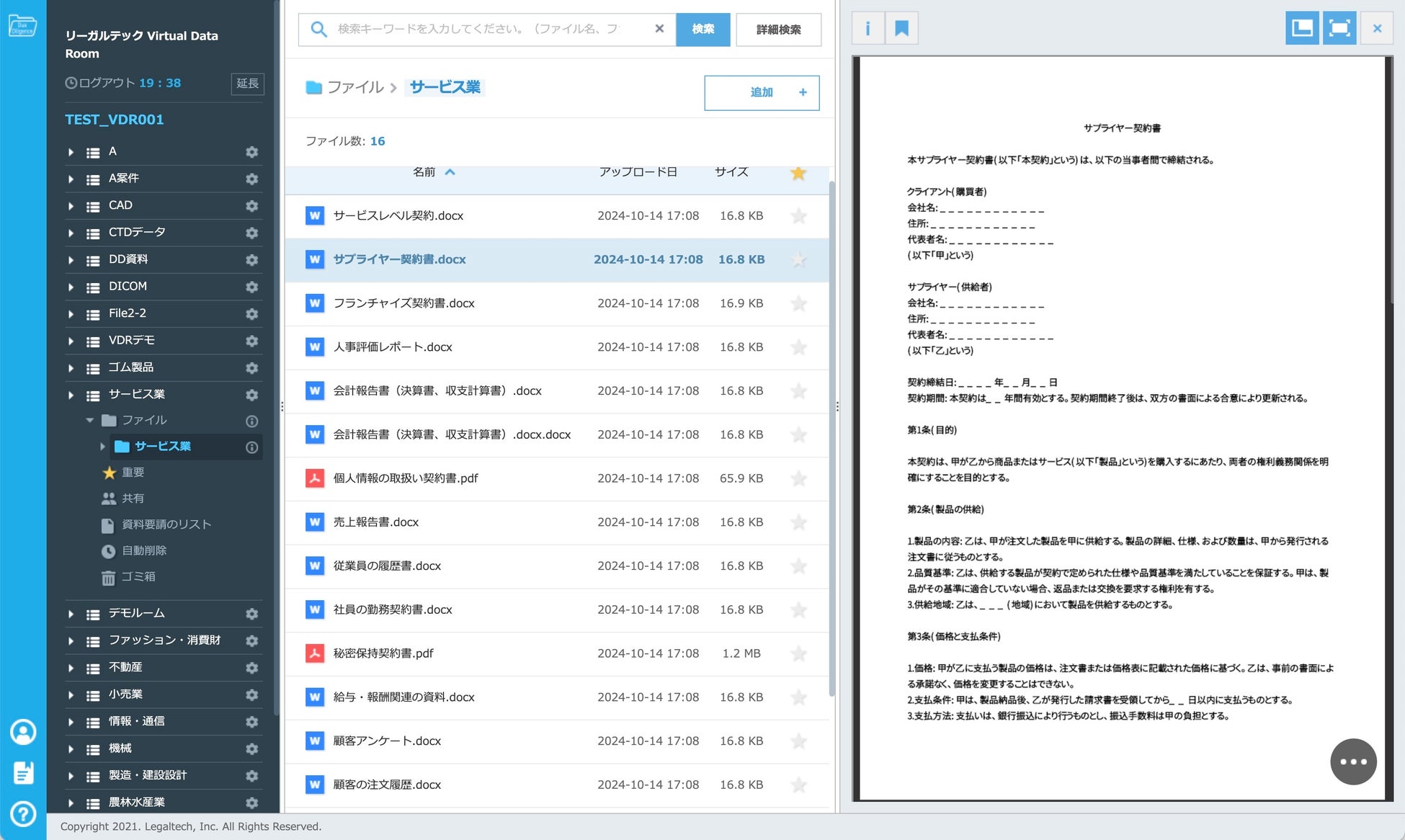 「LegalTech VDR サービス業」は、企業や法律関連業務のデータ管理や共有を支援するための高度な機能を備えたプラットフォームです。以下に、具体的な機能を挙げます。