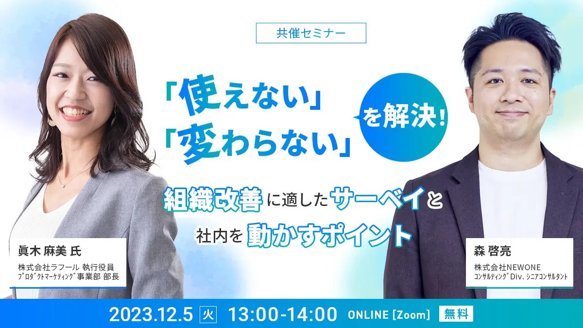 【12/5(火)ウェビナー】ラフール「使えない」「変わらない」を解決!組織改善に適したサーベイと社内を動かすポイント をテーマに、NEWONE社とセミナーを開催