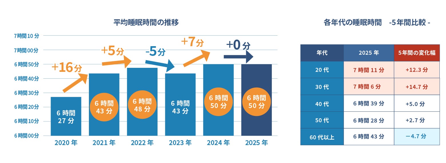 1.日本の睡眠時間の変化:2024年と比較して変化なし。20~30代は平均睡眠時間7時間を超える。