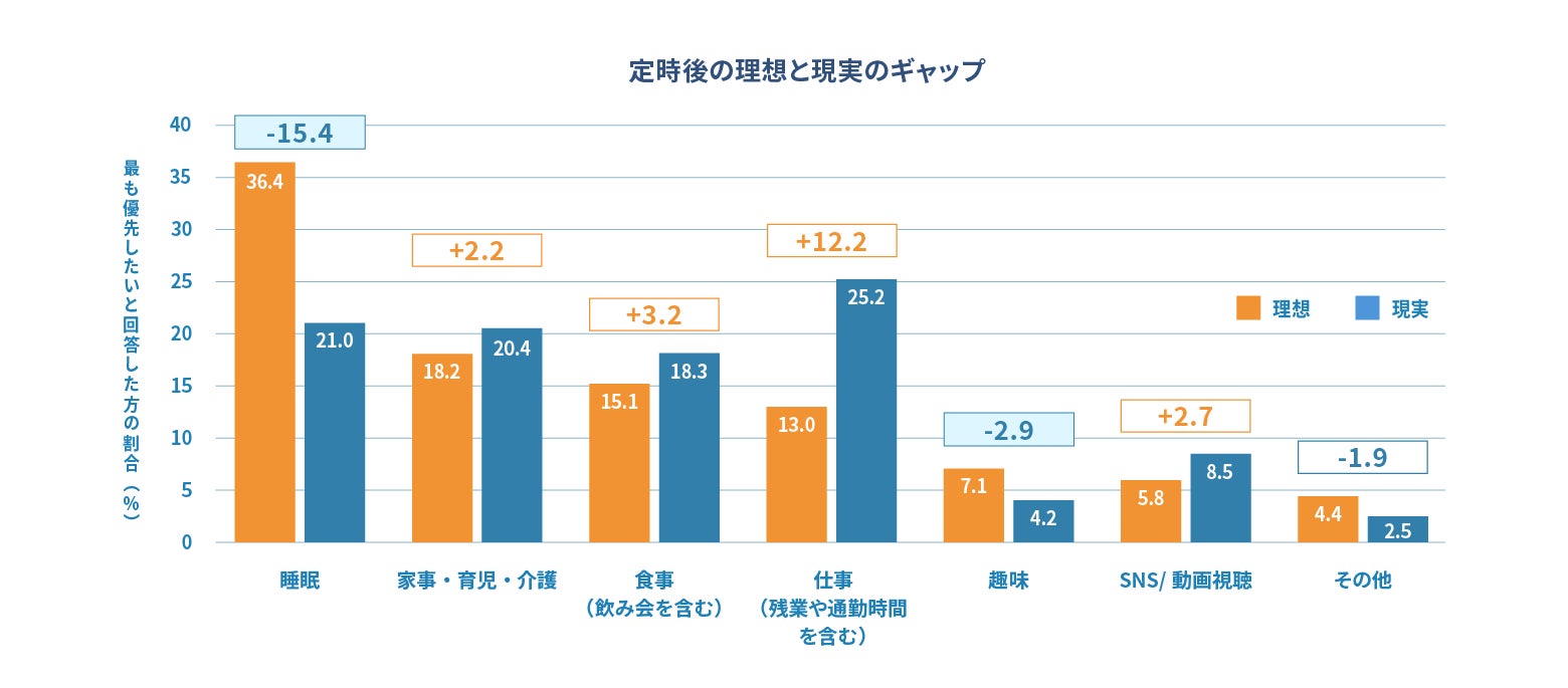 3.定時後の優先行動の理想と現実のギャップ:「睡眠」を優先したいと思っているが、実際は「仕事(残業や通勤時間を含む)」が優先されている