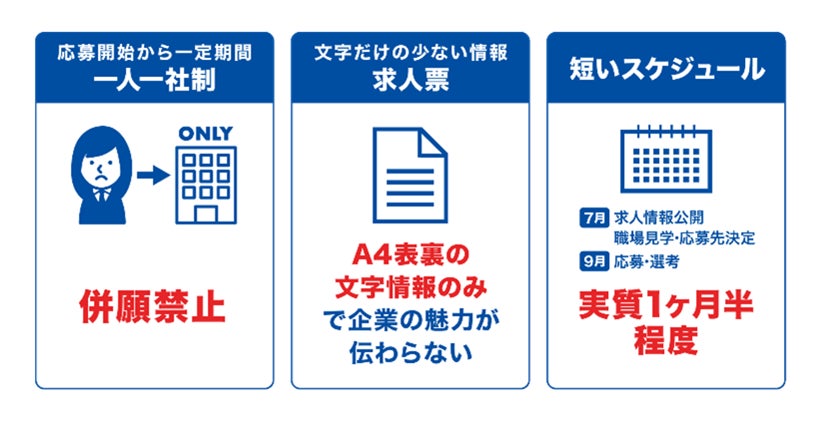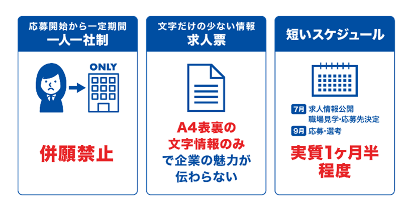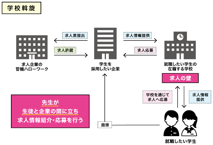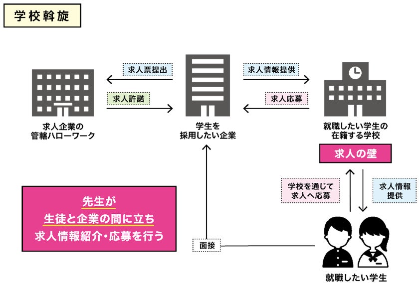 応募開始から一定期間は、1社応募に限定する1人1社応募や、応募時の校内選考、高校の先生に付与される求人票「高卒求人WEB」へのアクセスなど独自の慣行が戦後長く続いています。