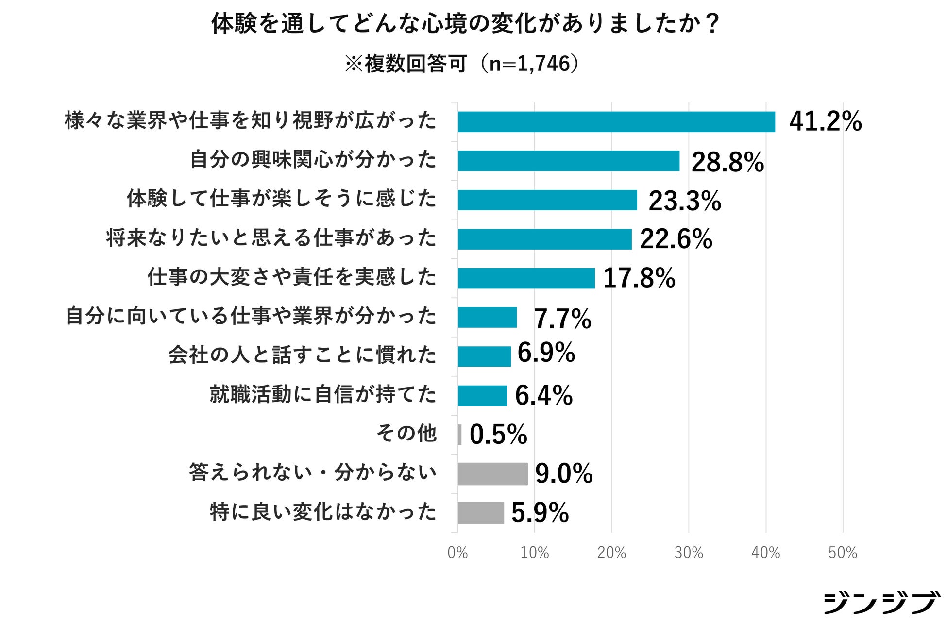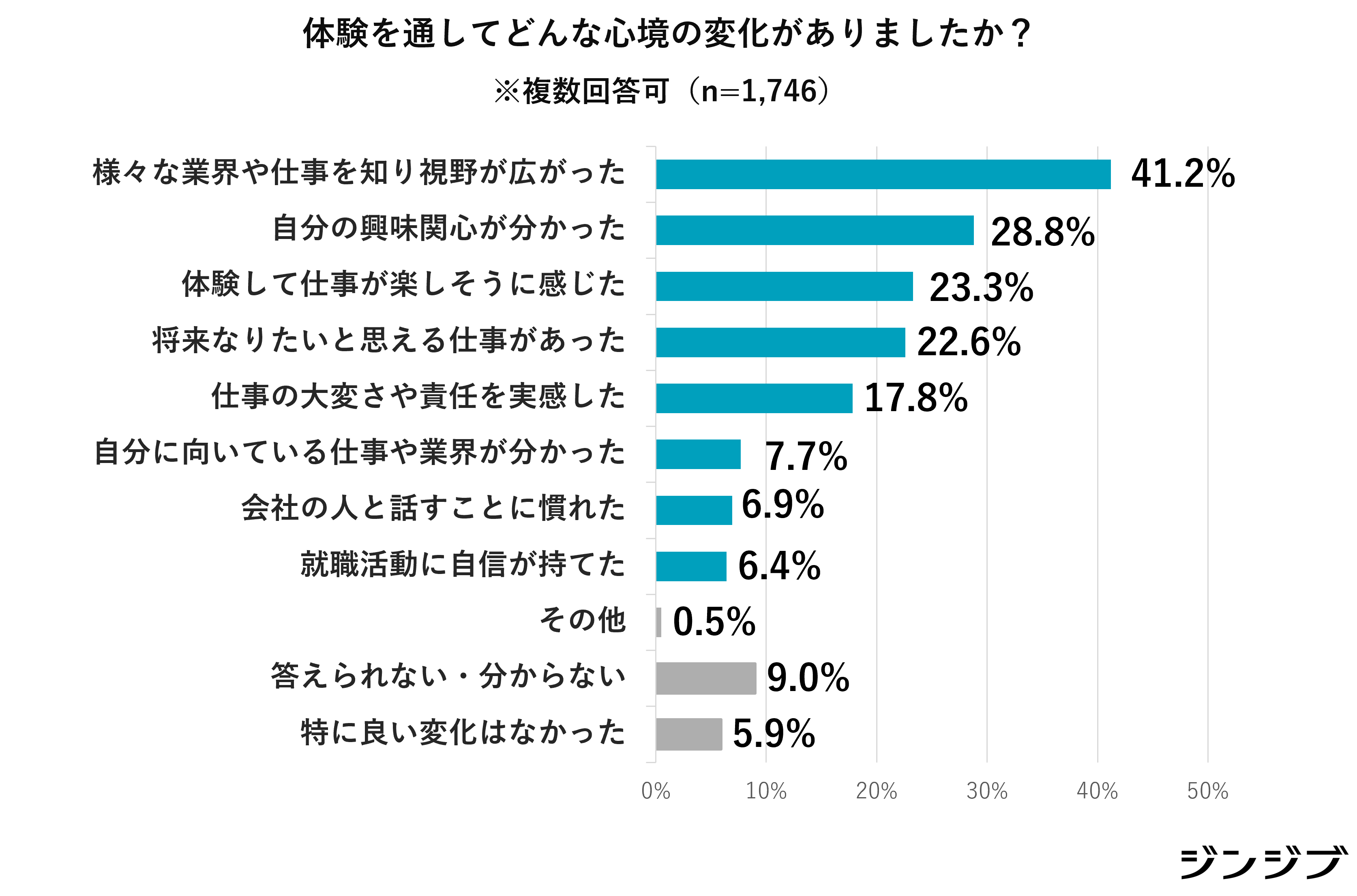 「おしごとフェア」に参加しアンケートに回答した高校生の77.9%が「良い変化や新しい気付きがあった」と回答し、具体的な変化では、「様々な業界や仕事を知り視野が広がった(41.2%)」「自分の興味関心が分かった(28.8%)」、「体験して仕事が楽しそうに感じた(23.3%)」と回答しました。
