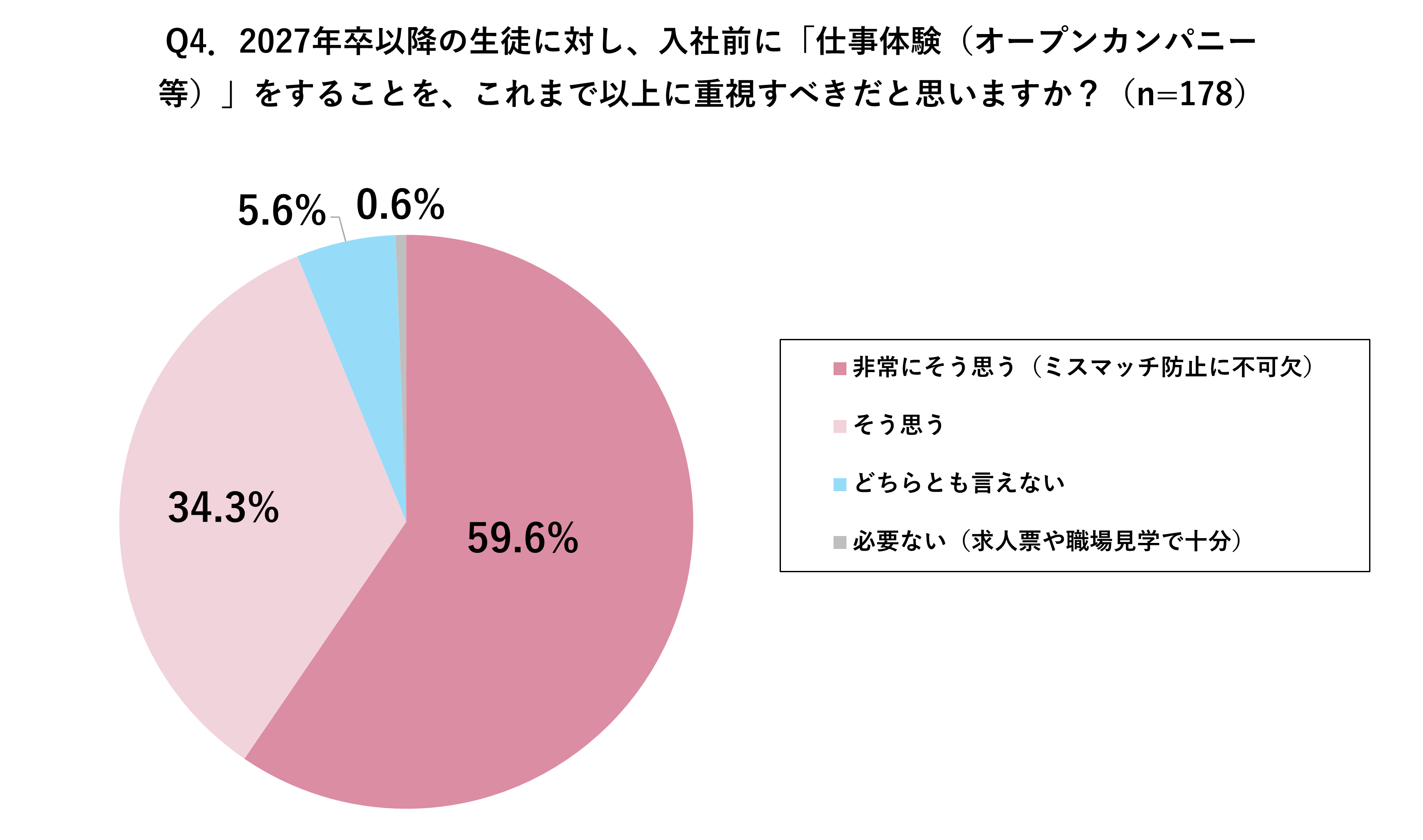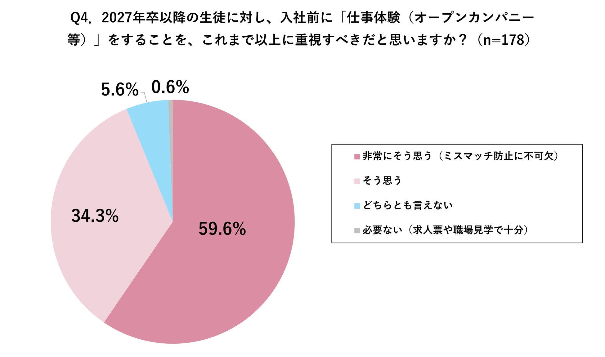 また、先生に、入社前に生徒が「仕事体験」を重視すべきだと思うか質問したところ、「非常にそう思う」59.6%、「そう思う」34.3%と9割以上の方が重視すると回答しました。