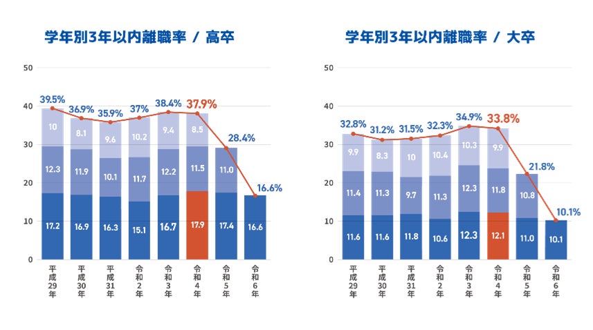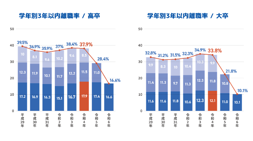 1人1社応募や短い期間での就職活動時のミスマッチにより、早期離職率の高さが課題となっています。特に、1年未満の離職率は16.6%と、大学卒の10.3%を上回っています(※4)。