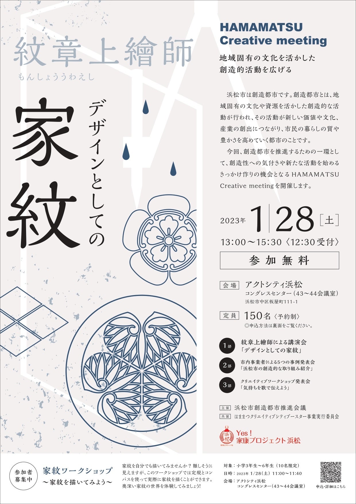 1000年の歴史を持つ家紋。その完成されたデザインの魅力を、家紋を手で描き入れる職人「紋章上繪師」から学びます。また、浜松市内の創造的な事業の実践者が取り組みを発表します。