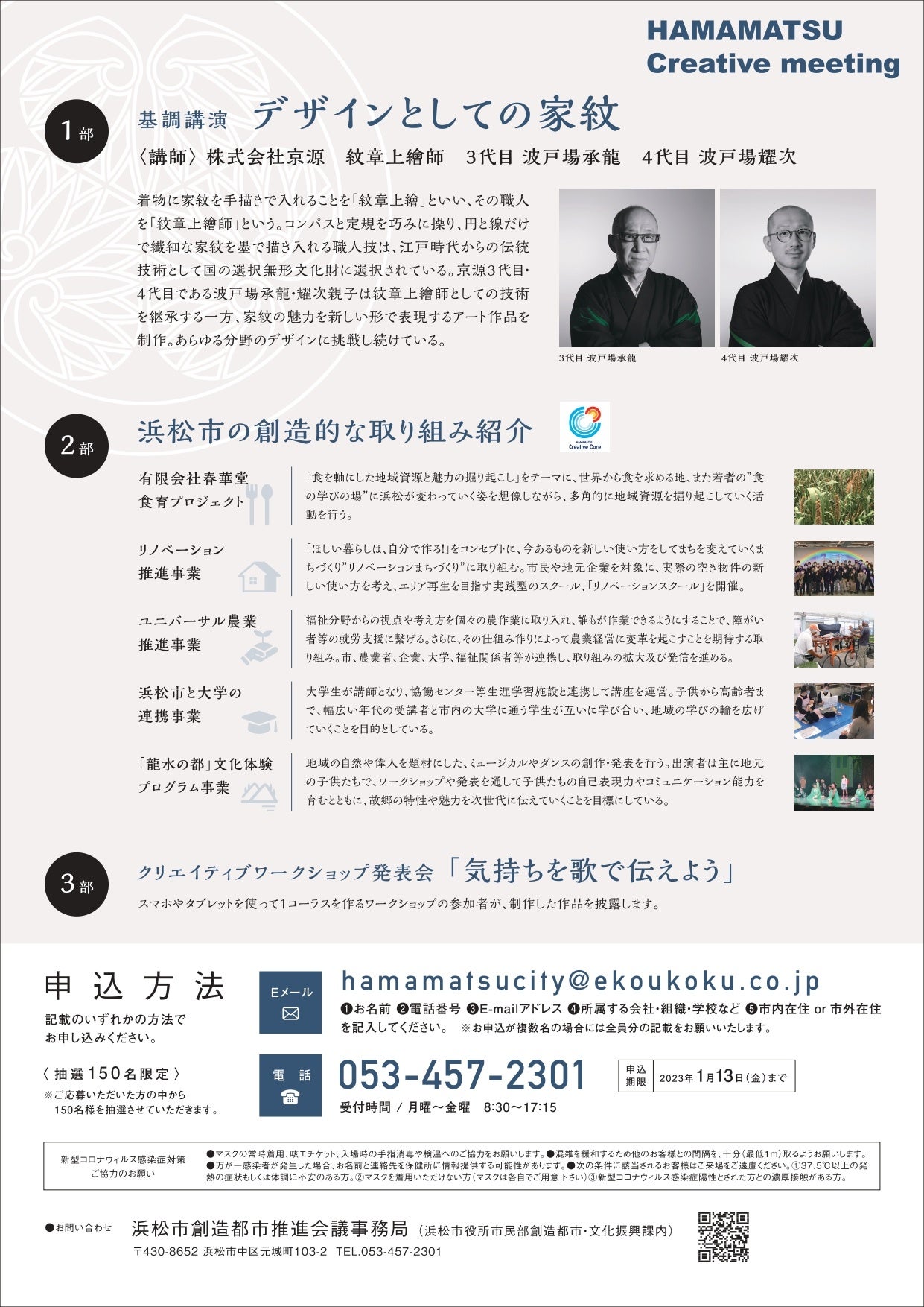 NHK Eテレ「デザインあ」にも出演されていた、家紋を手で描き入れる職人「紋章上繪師」の波戸場承龍先生・耀次先生が講演を行うほか、浜松市内の創造的な事業の実践者が取り組みを報告します。また、タブレットやスマホのアプリを活用して音楽を作成する「デスクトップミュージック」の作品発表も行います。