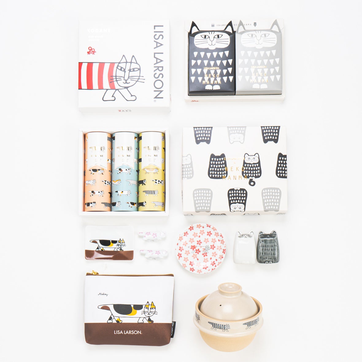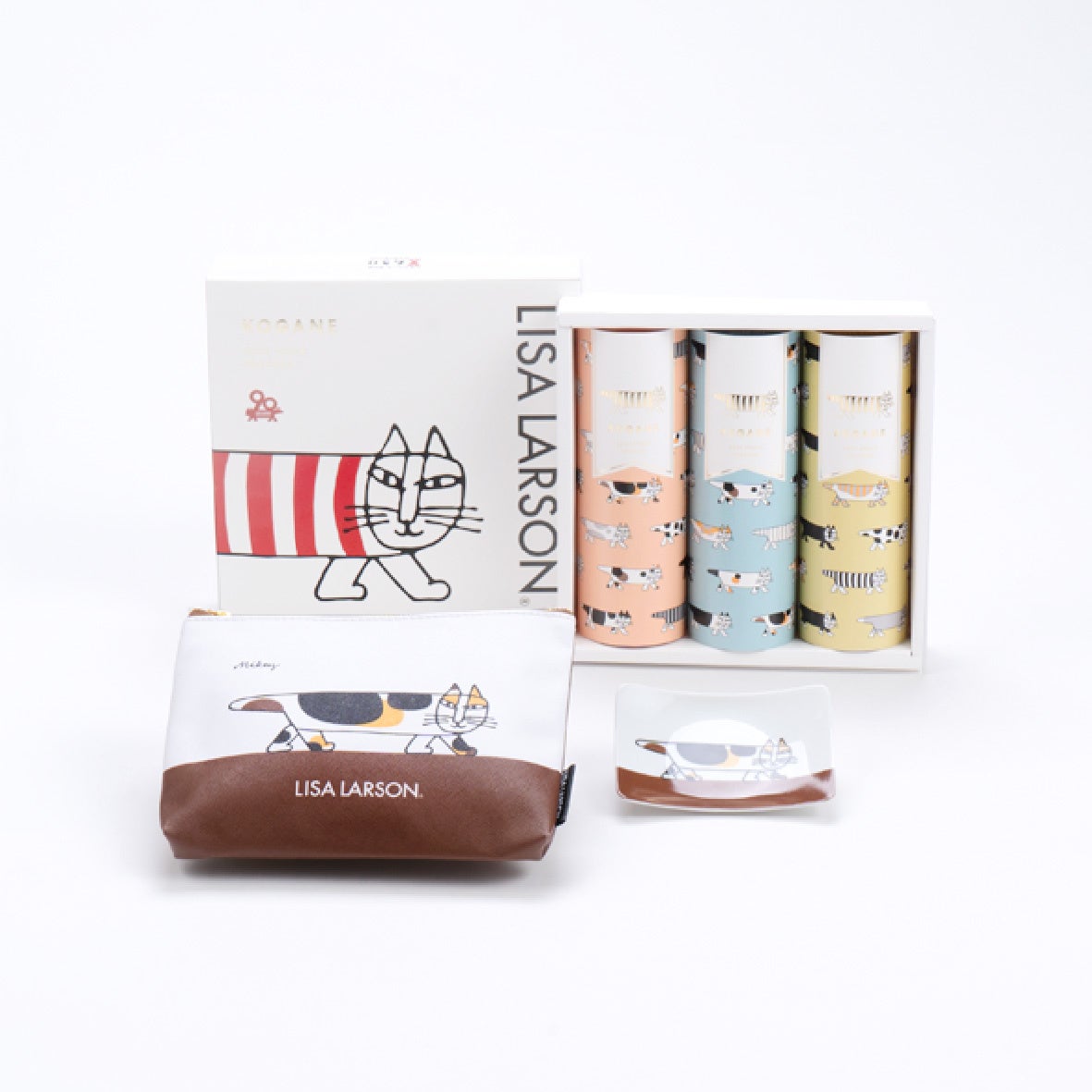 今回は「リサ・ラーソン生誕90周年」をお祝いする、猫のマイキーの限定パッケージ。だしの入った3つの小箱にはマイキーがいろいろな姿におしゃれした「lots of cats」が可愛くあしらわれています。箱は可愛くても中身は本格派。素材にこだわり余分なものを加えずに作った上質なだしを、お楽しみください。