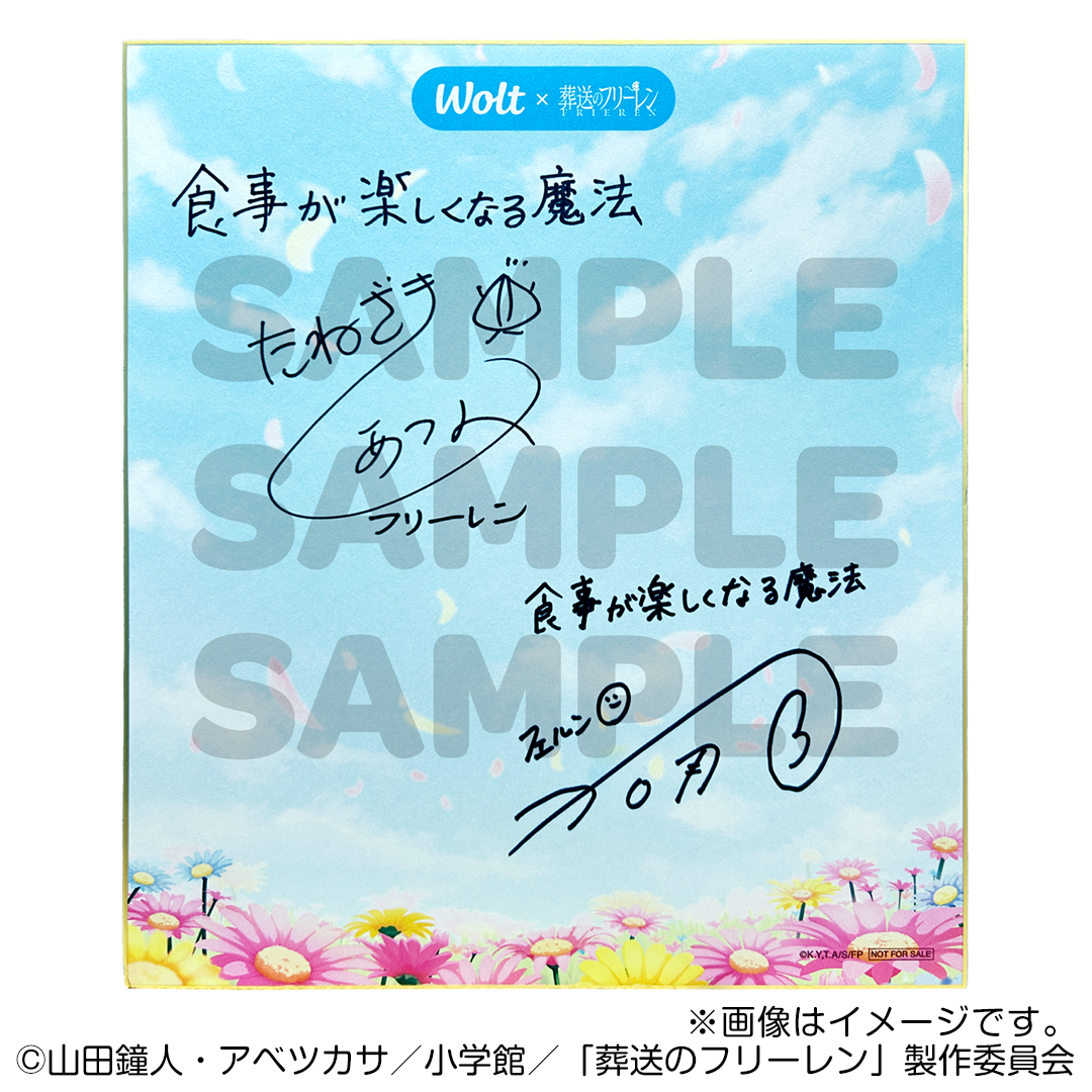 Woltの公式Xアカウントをフォロー後、キャンペーン投稿をリポストいただき、かつ、Woltで2,000円以上(※3)の注文を2回以上皆様の中から、抽選で3名様に、フリーレン役の種﨑敦美さんとフェルン役の市ノ瀬加那さんのお二人の直筆サインが書かれた色紙が当たります。Woltアプリのバナーやキャンペーンご案内メールに記載の専用フォームで応募いただけます。