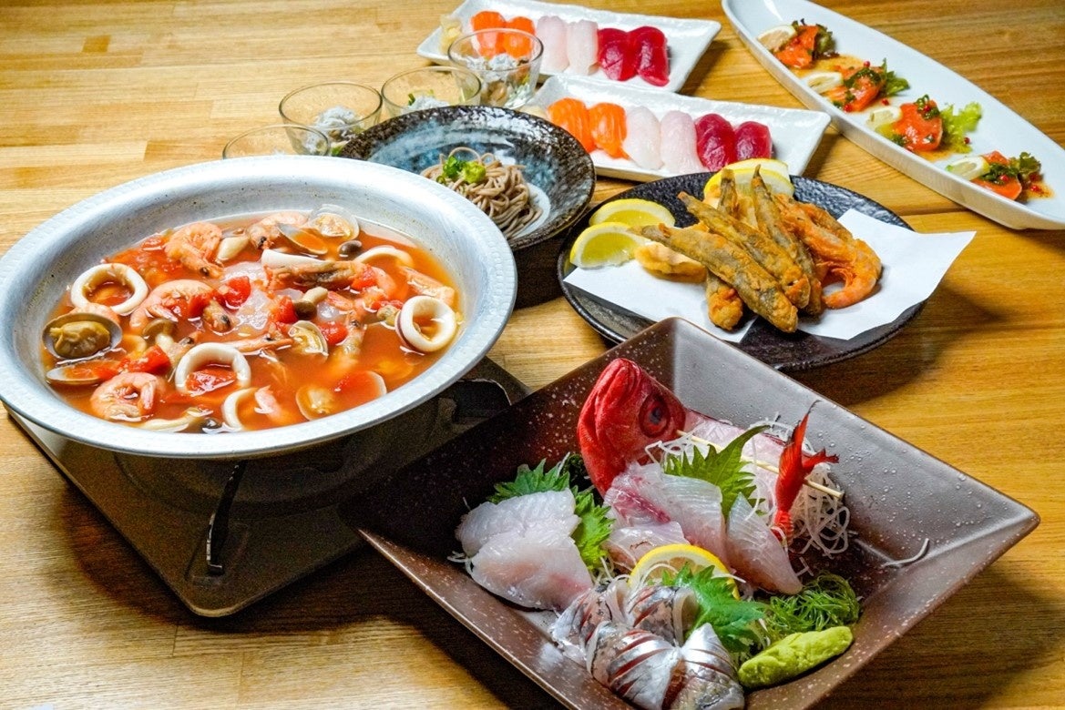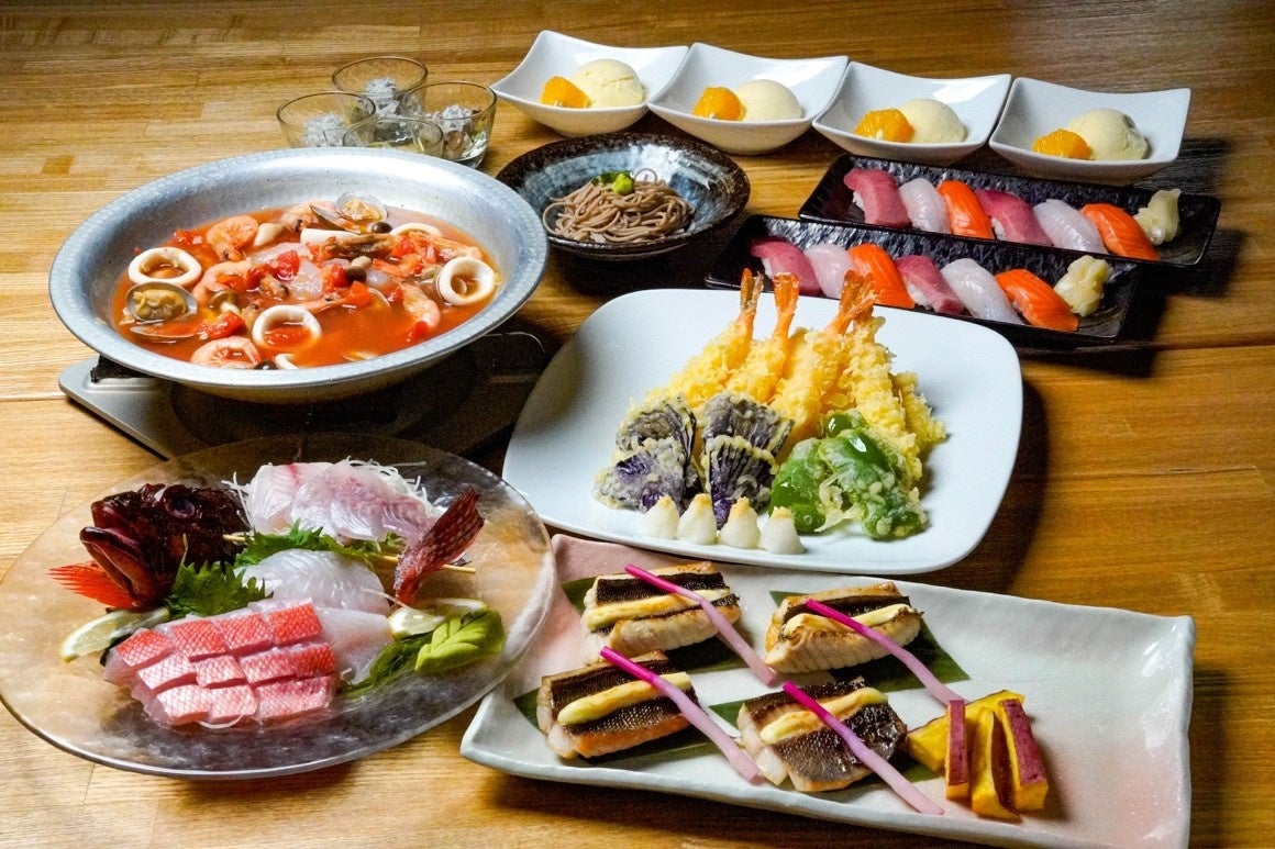 『湘南台酒場』の新たなご宴席コースメニューは品数と価格の異なる3タイプで展開いたします。黒潮コースは地魚など鮮度抜群の魚介をふんだんに使いトマトベースの地中海風スープにした「特製ブイヤベース」、「鮮魚の唐揚げ」や「地魚寿司三貫」など、漁港直送の鮮魚と旬の食材を味わい尽くす全7品。大切な人との宴席や特別な日には、さらに「天ぷらの盛り合わせ」や「厳選中トロ入りの地魚寿司三貫」、「本日のデザート」を加えて贅沢感のある全8品の鮮魚屋コースを。気軽な会合におすすめしたい潮コースは、「鮮魚のカルパッチョ」や「鮮魚の唐揚げ」、「しらすバスケットピザ」などカジュアルながらも当店自慢の魚料理を全6品で十分に楽しんでいただける内容です。