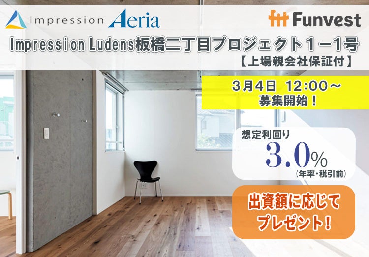「未来をわかちあう投資」を提供する「Funvest(ファンベスト)」(以下、Funvest)は、「Impression Ludens板橋二丁目プロジェクト1-1号【上場親会社保証付】」(以下、本ファンド)の募集を3/4より開始しますので、お知らせいたします。